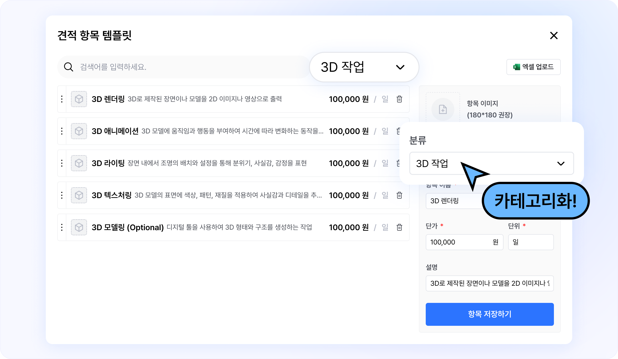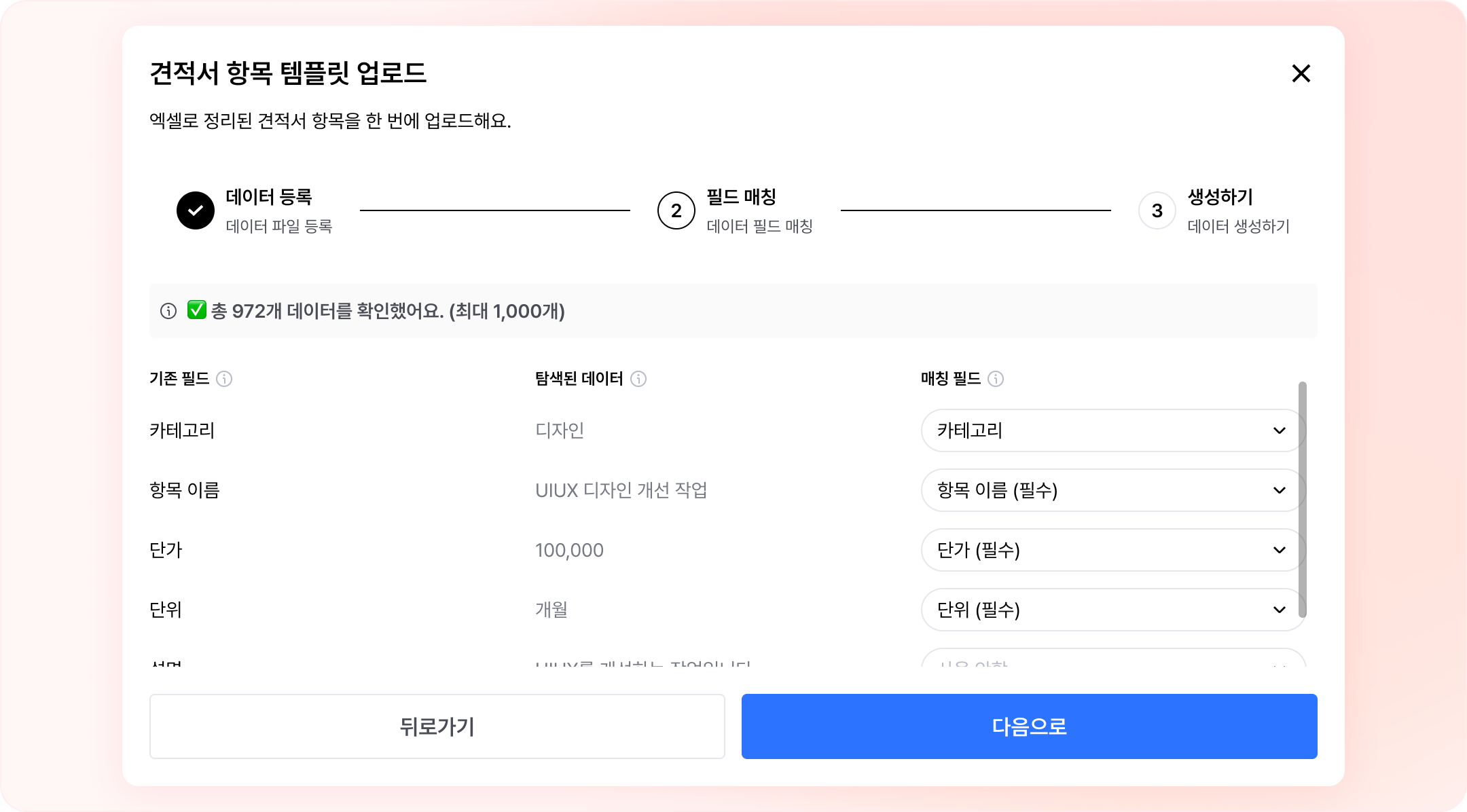기존에 사용하는 견적서 항목을 하나하나 입력하지 않고, 엑셀 임포트로 한 번에 올릴 수 있게됐어요.