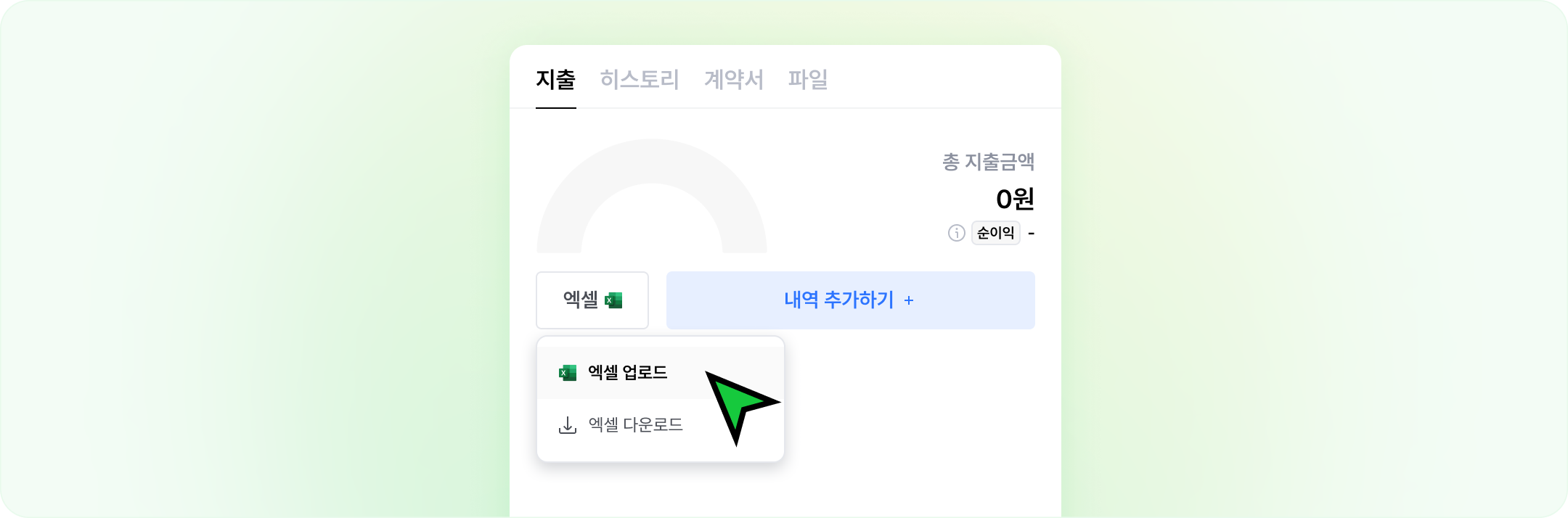 계약 별 지출 내역을 한 번에 업로드하기! 하나씩 입력했던 내역을 엑셀로 임포트하고, 한 번에 내려받을 수 있어요.