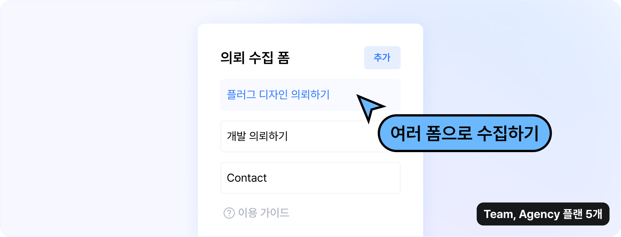 하나의 비즈니스(워크스페이스)당 하나만 생성할 수 있었던 기존 폼을 여러개 생성할 수 있게 됐어요. Freem Basic : 최대 1개 / Team, Agency: 최대 5개
