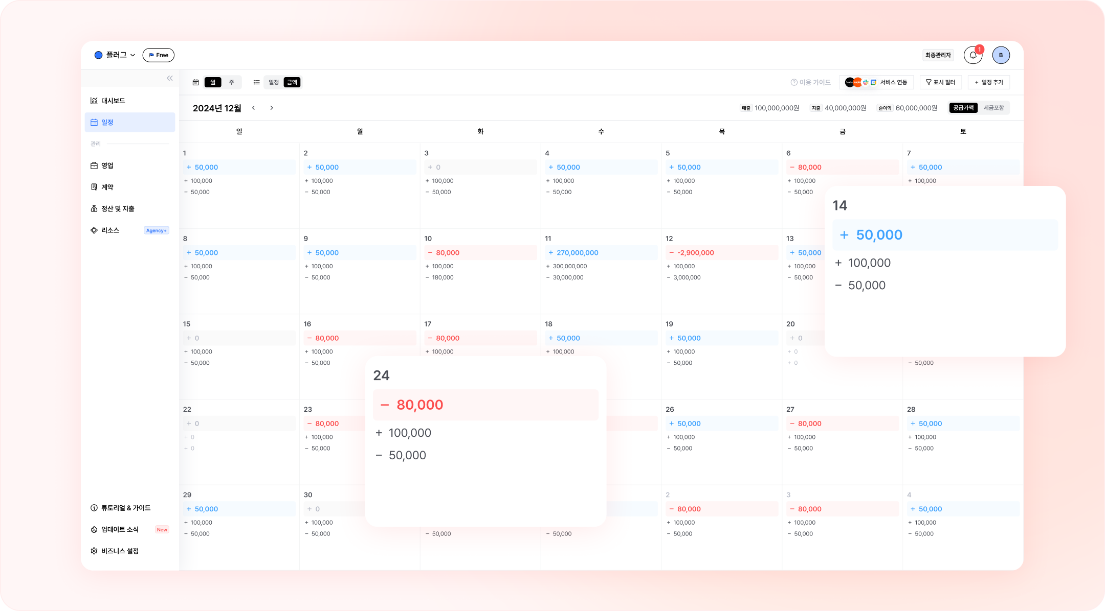 매출, 지출 내역을 기반으로 일간 손익 금액을 한 눈에 확인할 수 있는 금액 달력 기능이 추가됐어요.