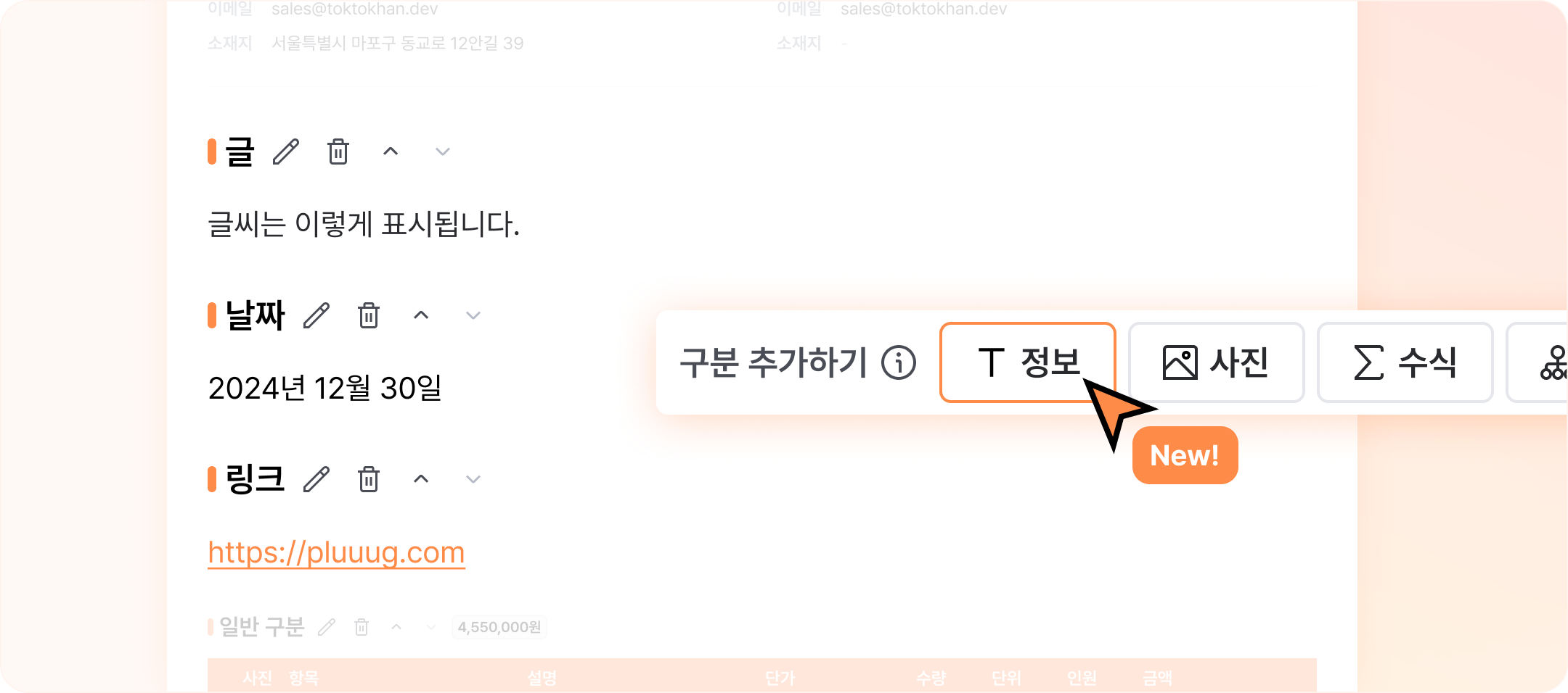 견적서에 추가로 기재해야하는 중요한 정보들(견적 기한, 납기일, 링크 등)을 입력할 수 있도록, 정보 구분이 추가됐어요.