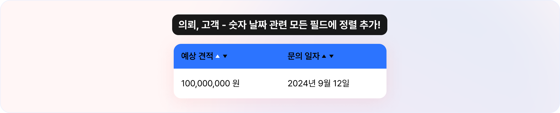 의뢰, 고객 부분에서 날짜, 숫자 등 정렬 가능한 필드에 정렬을 이용할 수 있도록 기능이 추가됐어요.