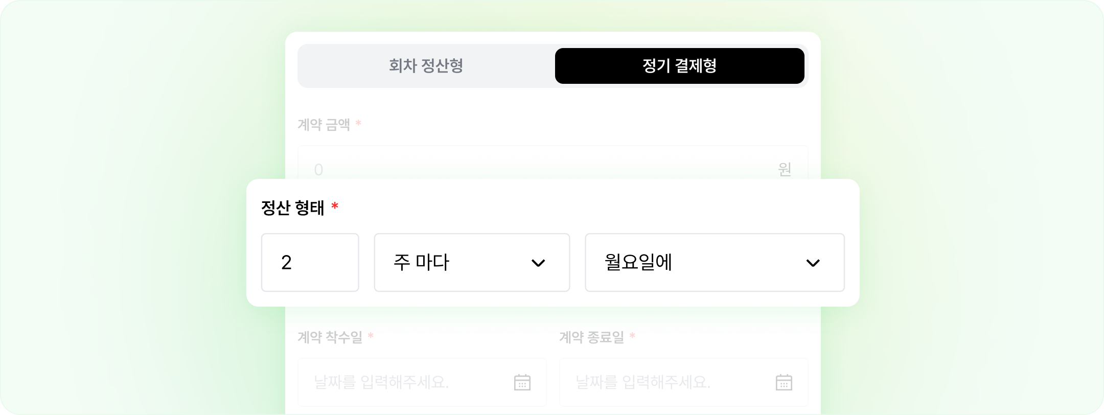 기존 연간, 월간으로만 생성할 수 있었던 정기결제형이 N주 간격 / N개월 간격으로 설정할 수 있도록 변경됐어요.