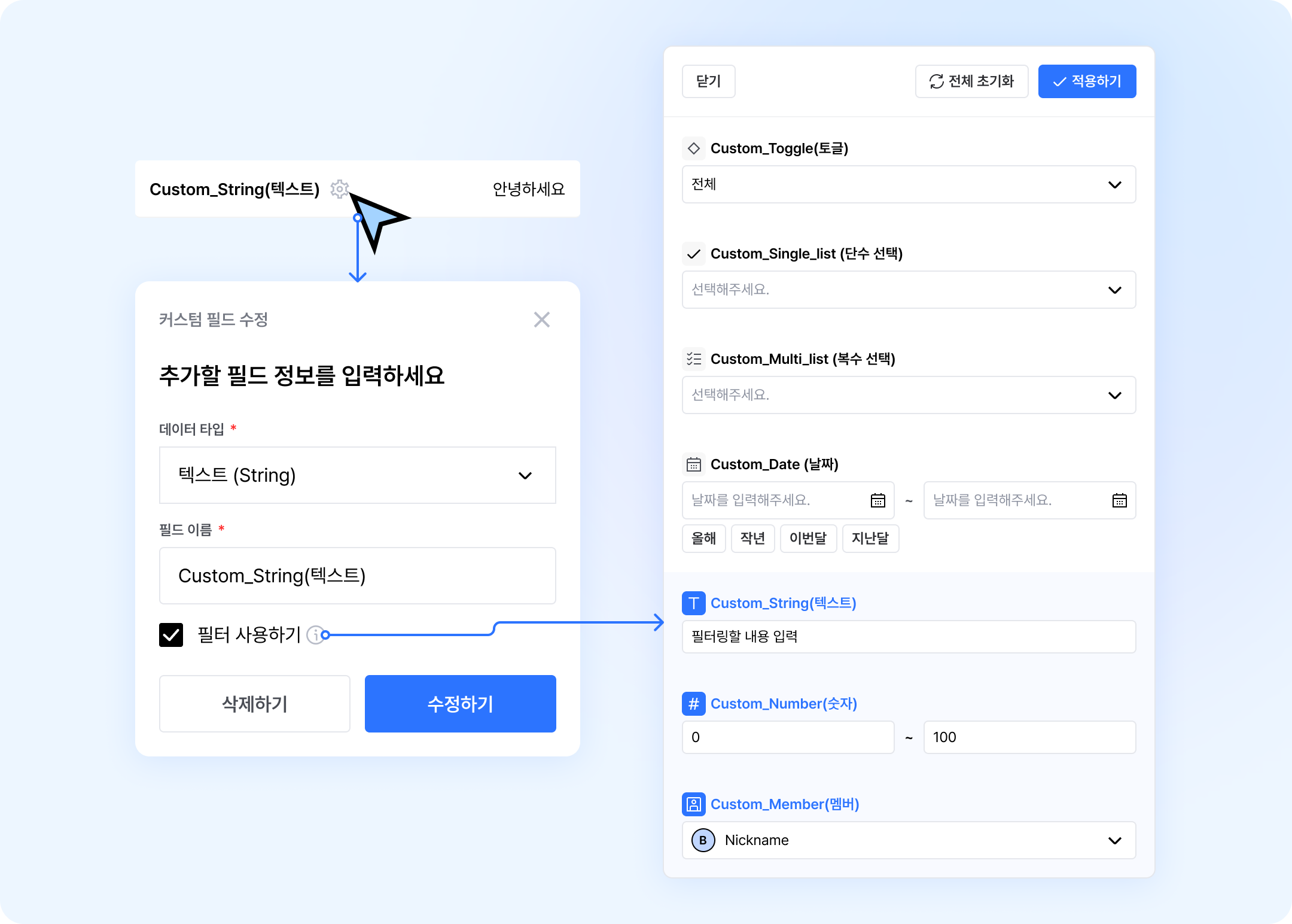 리스트 화면 '필터'에서 해당 필드가 추가된 것을 확인할 수 있어요.