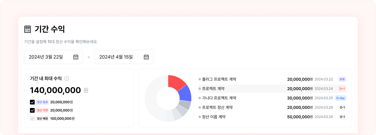 기존에 이번 달, 올해 정산 예정 금액을 대시보드로 확인할 수 있었는데 이제 딱 필요한 기간을 필터링해서 확인해볼 수 있어요!