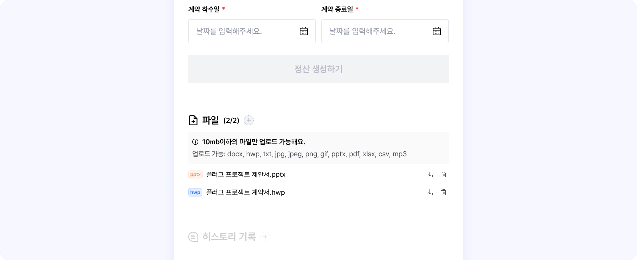 계약 데이터 별로 계약서, 견적서 등 여러가지 파일을 등록해 저장해둘 수 있어요.