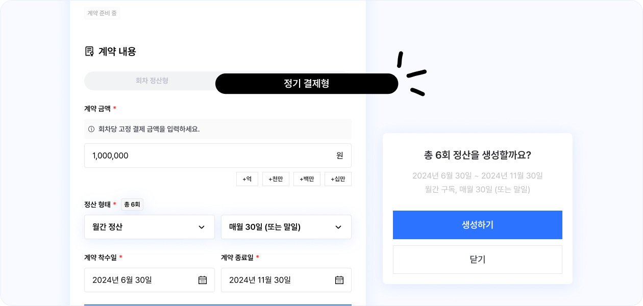 기존에 착수금+중도금+잔금 형태의 회차 정산형 계약만이 관리가 가능했는데요, 이번 업데이트에서 구독형으로 정산을 관리하는 계약도 관리할 수 있도록 기능을 추가했어요!