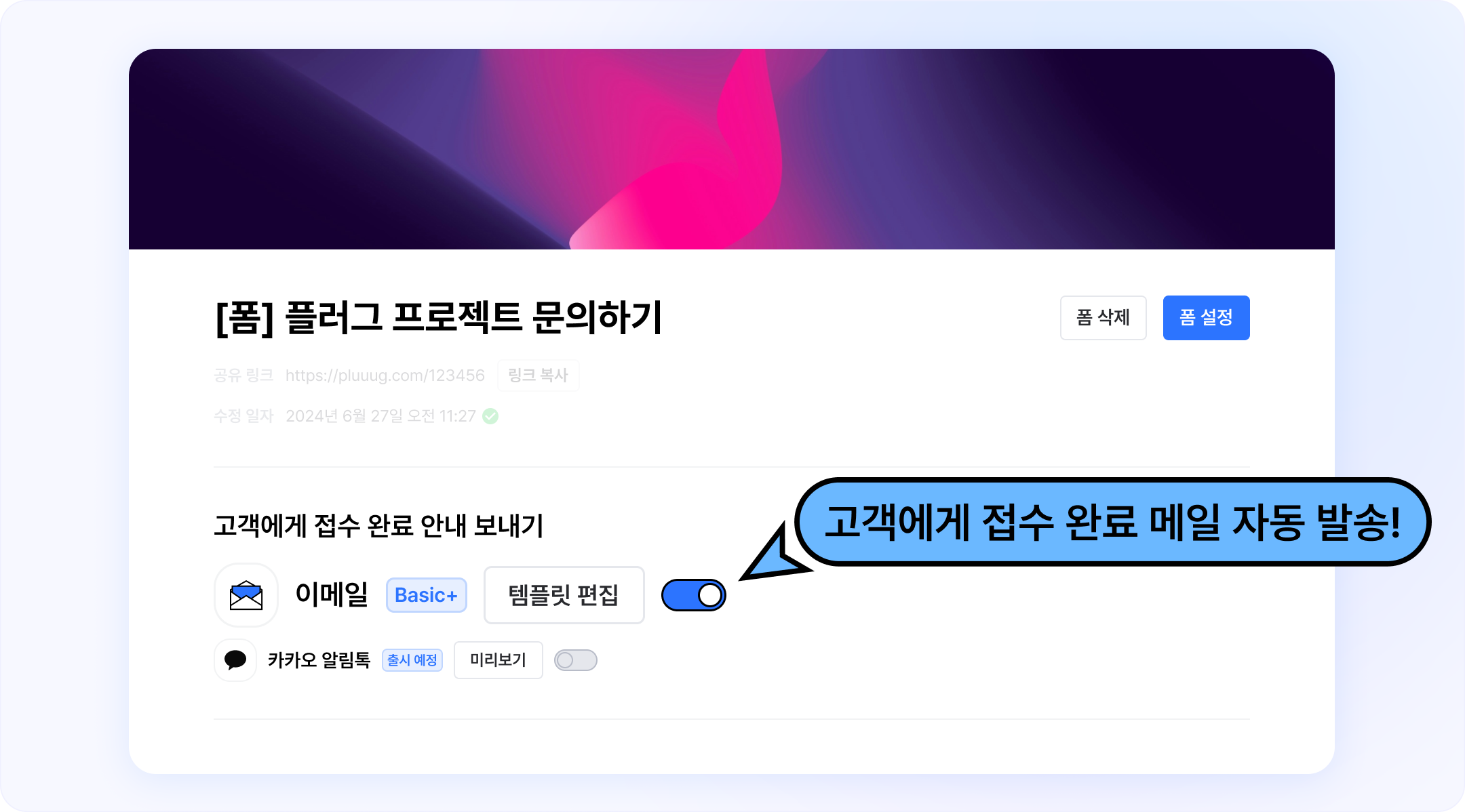 자동 안내 세팅: 영업 > 폼 > 고객에게 접수 완료 안내 보내기 > 이메일 > ON으로 설정