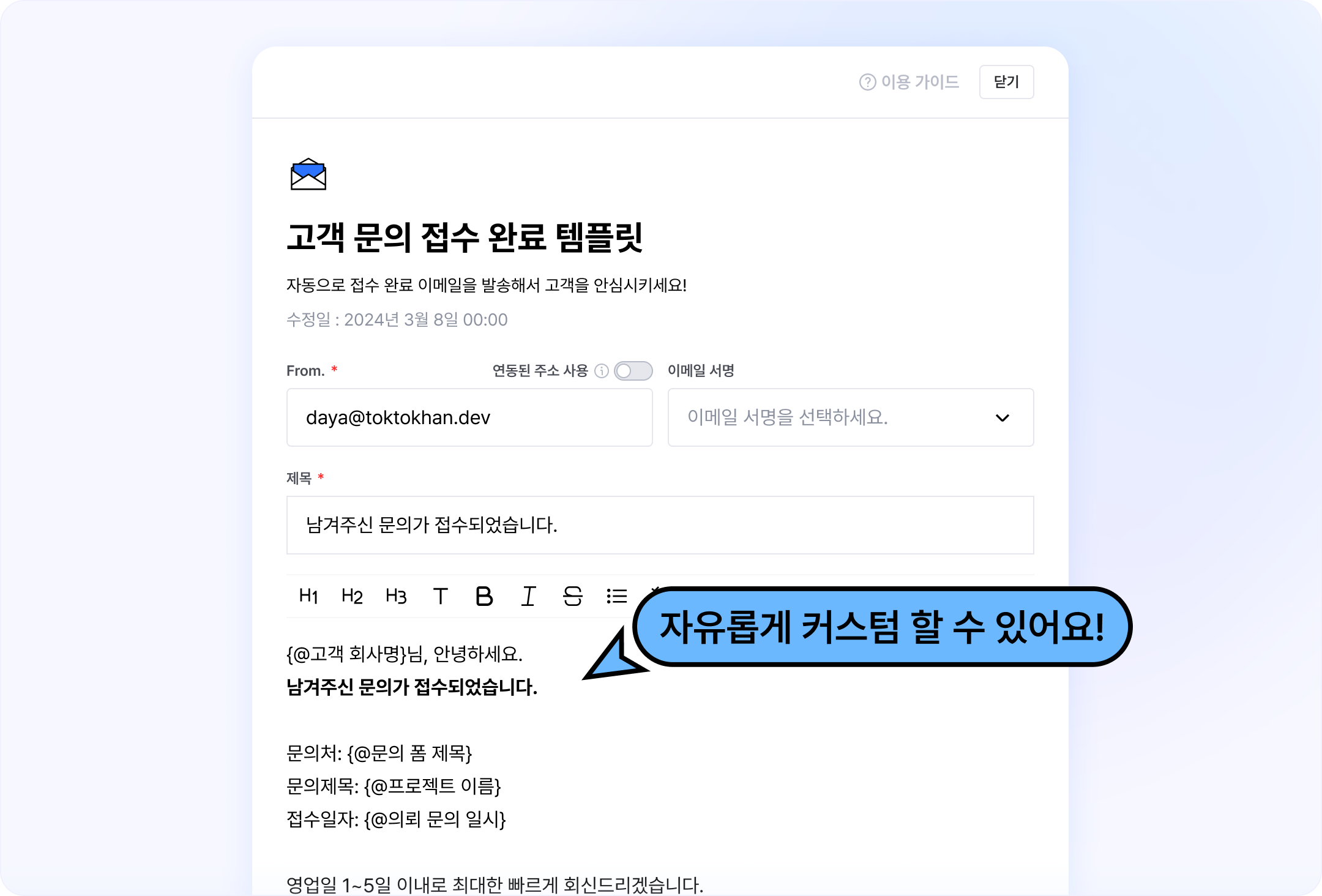 플러그에서는 문의가 도착하면 슬랙, 이메일로 알림을 받아볼 수 있는데요, 고객에게는 자동 안내가 보내지지 않는다는 점이 아쉬웠어요. 이제 메일 템플릿을 커스텀으로 구성해두면 문의가 제출됐을 때 고객에게 자동으로 안내 메일이 발송돼요.
