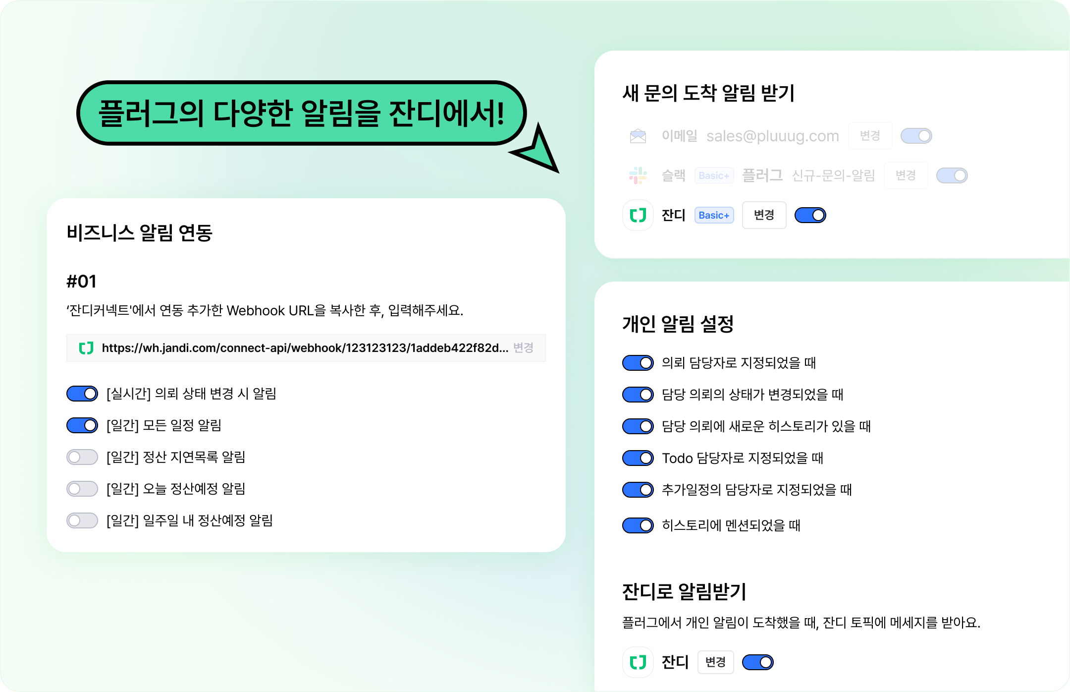 비즈니스 공통 알림 설정: 비즈니스 관리 > 서비스 연동 > 잔디 연동