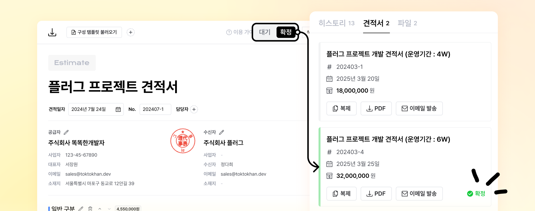 하나의 의뢰 건 안에서도 여러 개의 견적이 핑퐁한다면 주목! 최종적으로 확정된 견적서에 [확정] 상태를 부여해보세요.