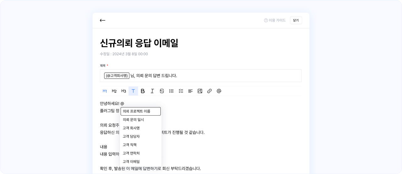 각 상황별 이메일 템플릿에 변수명을 걸어두면, 반복적으로 작성해야했던 이메일을 자동으로 작성할 수 있어요.