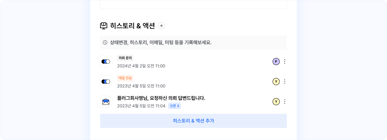 각 의뢰 별로 이메일 발송 히스토리가 자동으로 쌓여요. 이메일 발송 시 작성했던 내용과 오픈 횟수를 트래킹할 수 있어요.