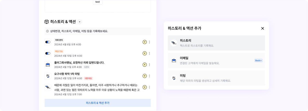 기존에 따로 떨어져있는 [미팅]도 히스토리에서 한 눈에 볼 수 있어요.