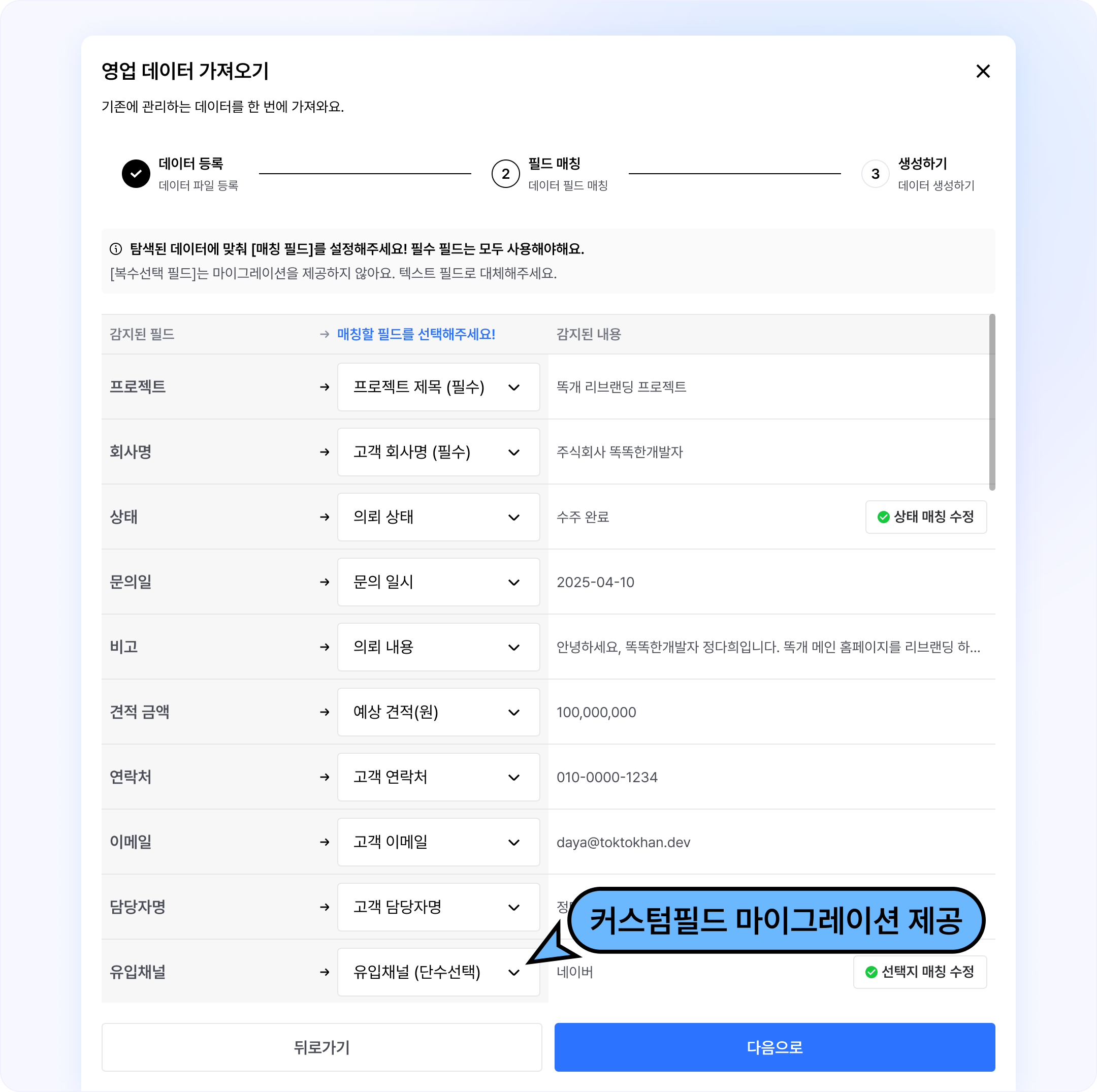 [기본필드]만 업로드 가능했던 영업, 고객 데이터! [커스텀필드]도 업로드가 가능하도록 기능이 확장됐어요.
