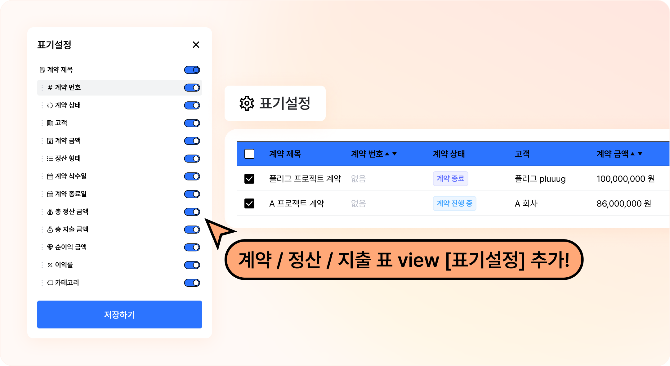 기존 [계약/정산/지출] 표 view에서는 제공되지 않았던 표기설정 기능을 추가했어요.