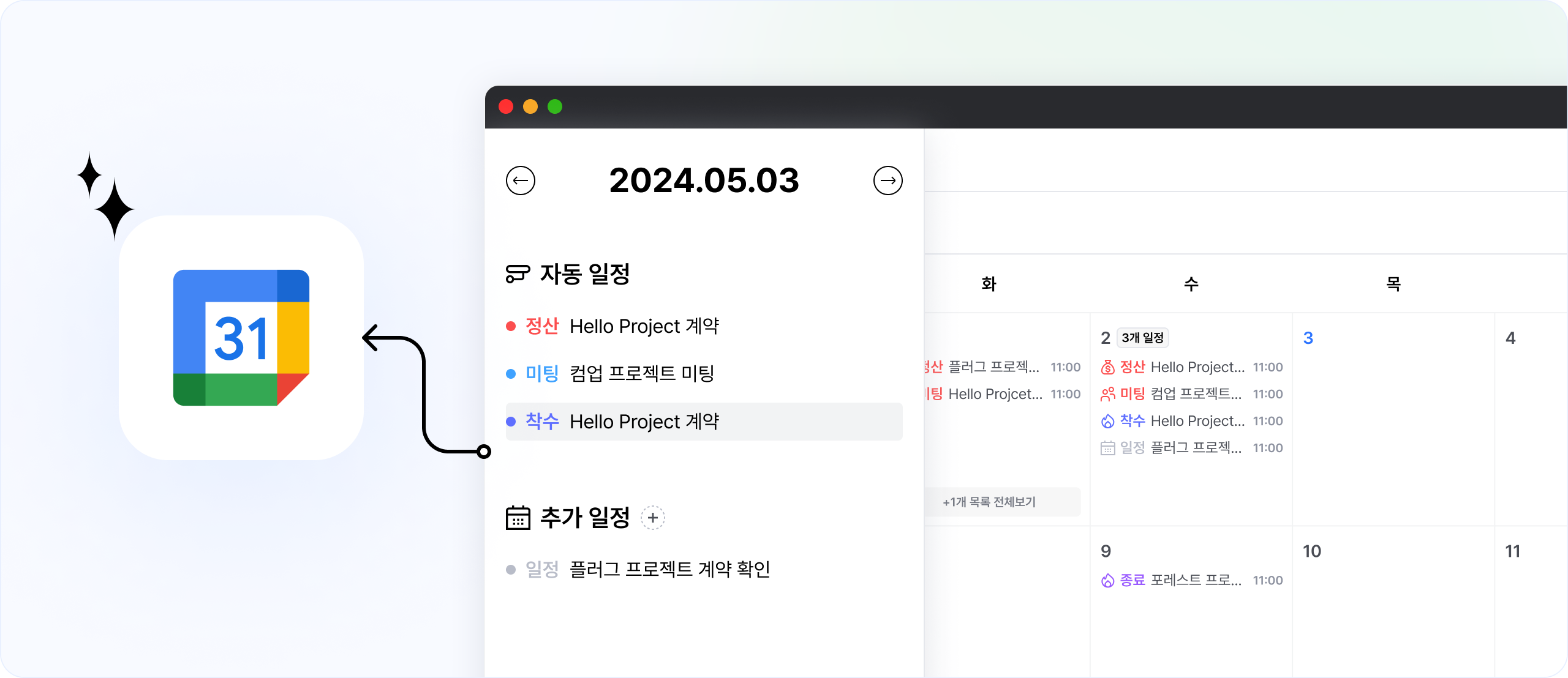 플러그와 구글캘린더를 연동하세요! 플러그의 자동 일정들이 구글캘린더에 자동 등록, 연동돼요.
