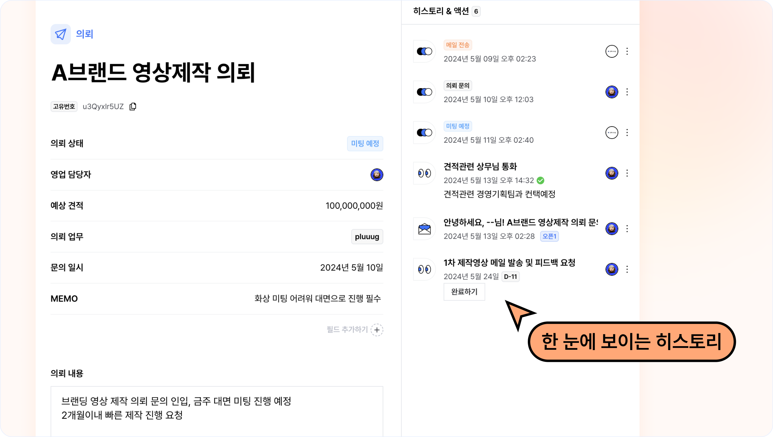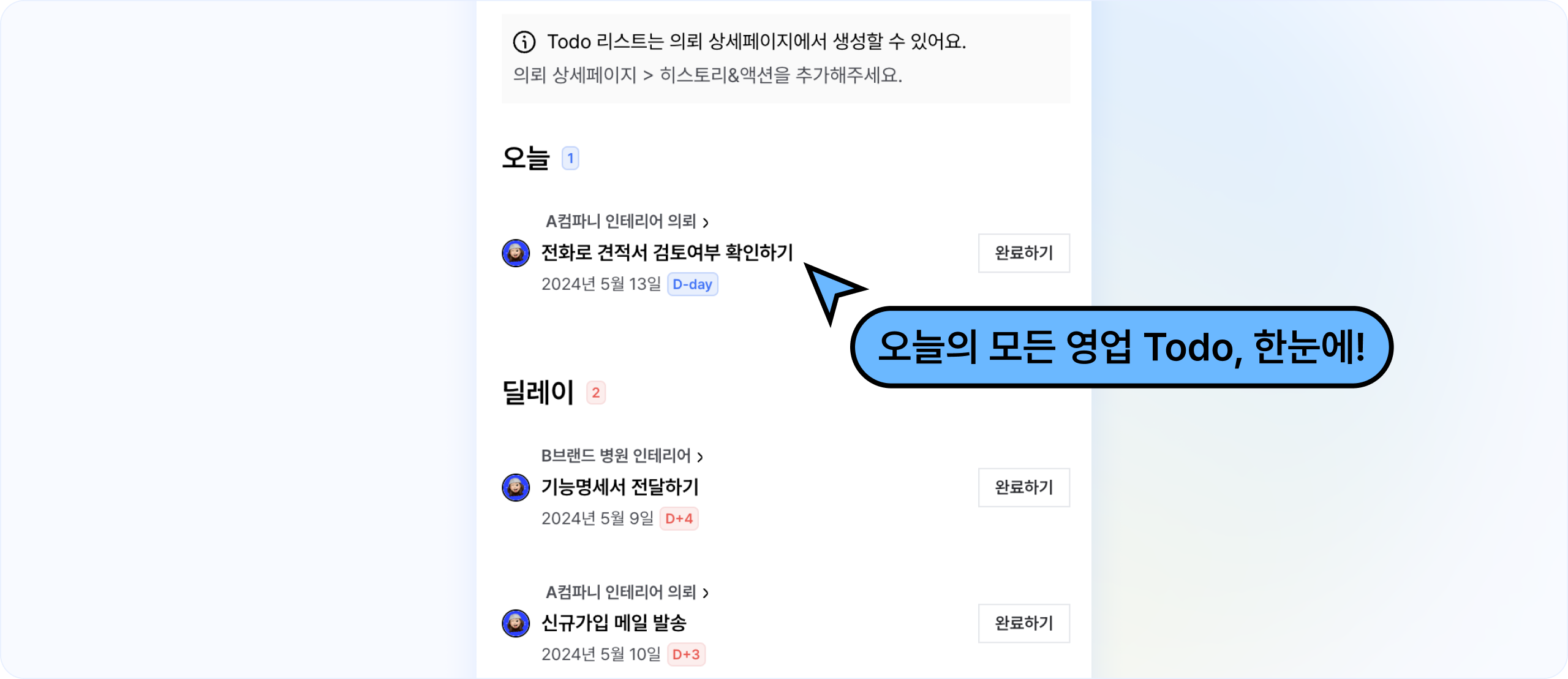 각 의뢰에서 투두리스트를 생성해두고, 일정을 체크해 놓치는 리드 없이 관리할 수 있어요.