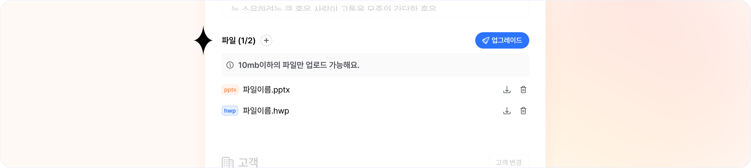 의뢰, 미팅, 고객 각각 데이터에 파일을 저장해둘 수 있어요.
