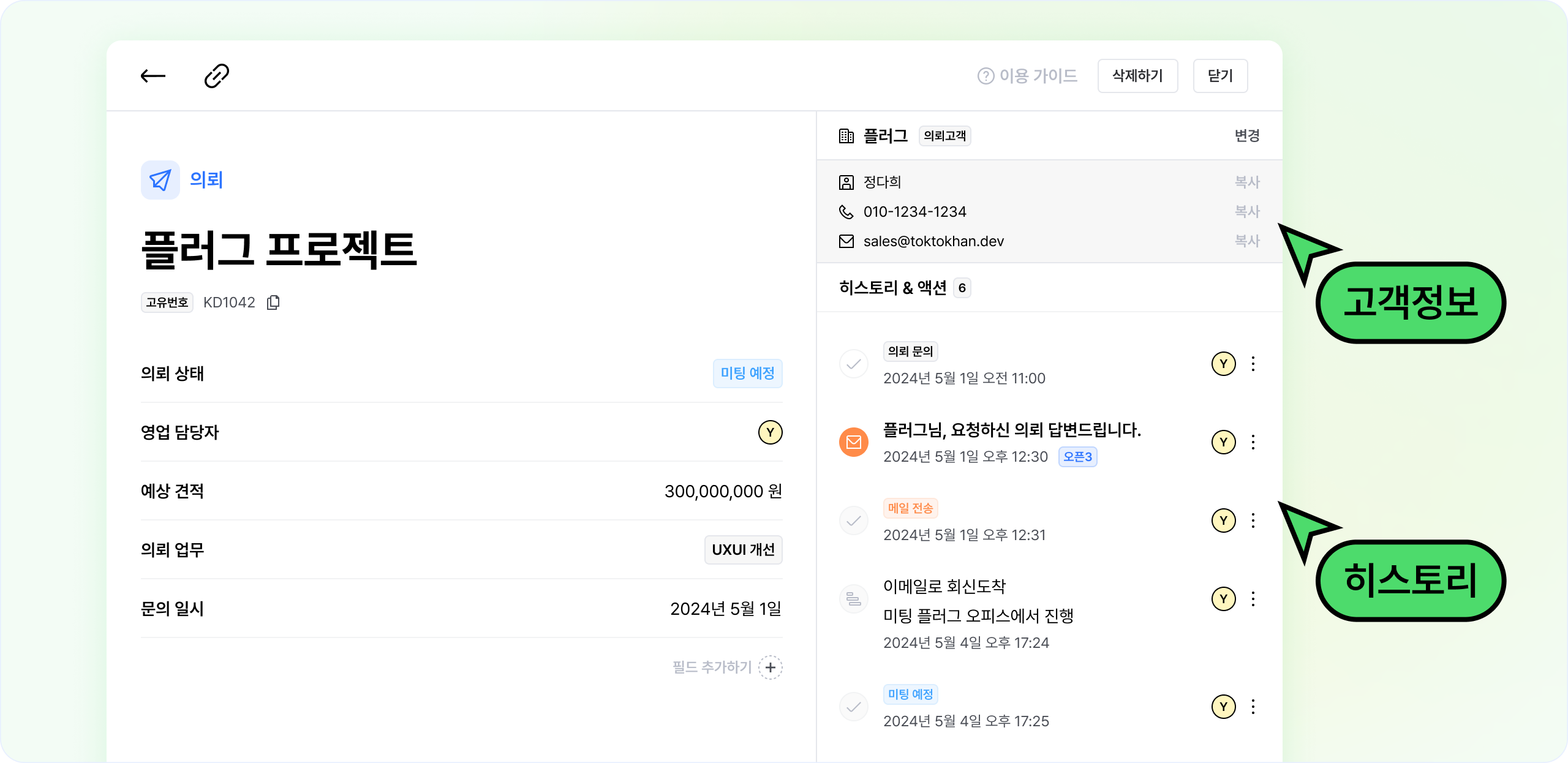 고객 정보와 히스토리 정보 그리고 의뢰 내용을 한 눈에 확인할 수 있도록 UX를 개선했어요.