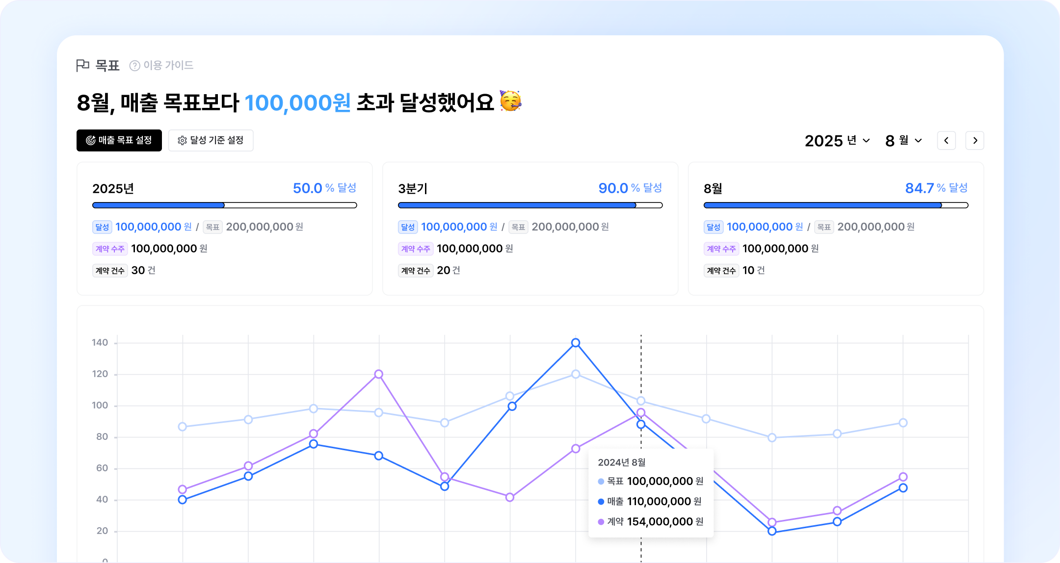 목표 대시보드는 '매출' 금액의 목표를 설정하고, 달성 금액을 확인할 수 있는 대시보드인데요, 실제 매출 데이터가 아닌 [수주일자]를 기반으로 성사된 계약의 건 수는 몇 건인지, 수주된 총 금액은 얼마인지도 함께 비교하여 확인할 수 있도록 대시보드가 고도화됐어요.