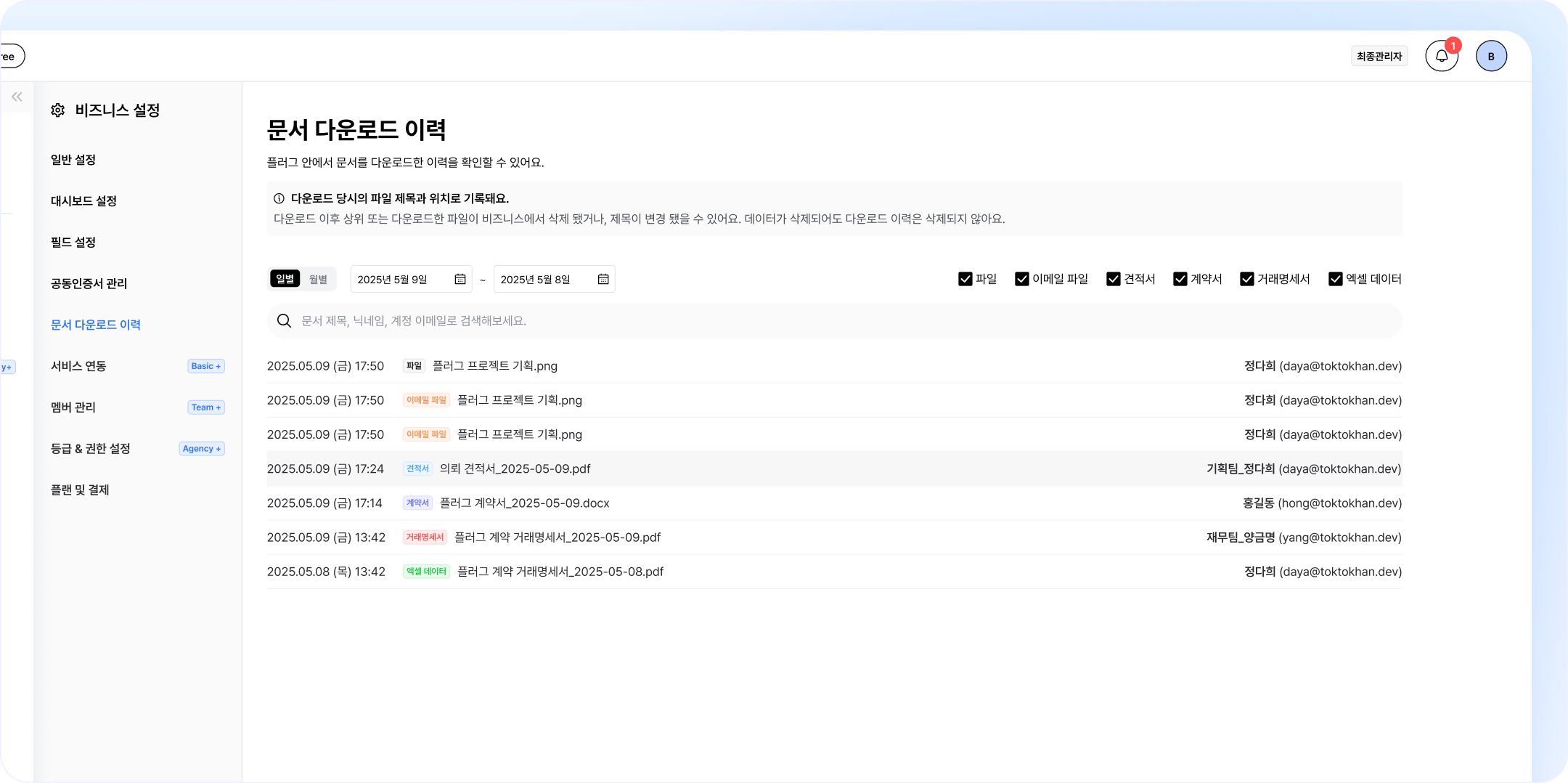 Agency 플랜에서는 멤버의 문서 다운로드 이력 보기 권한을 제한할 수 있어요.