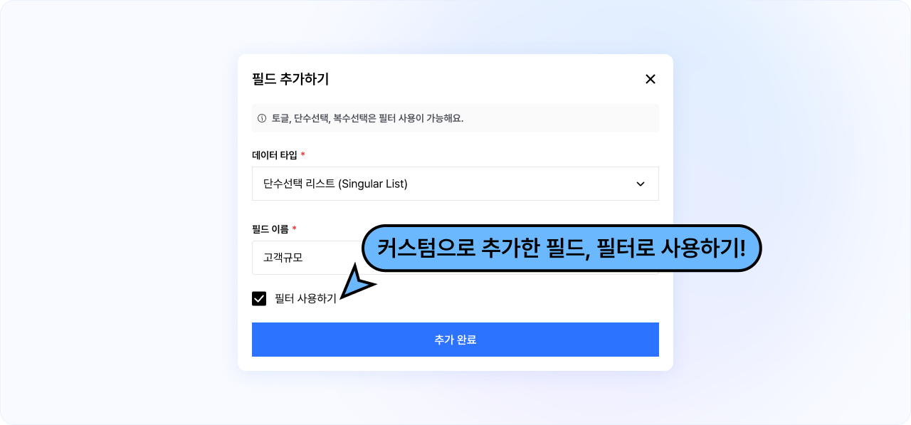 기본 필드가 아닌 커스텀으로 추가한 필드들도 필터링해서 확인할 수 있는 기능이 추가됐어요.