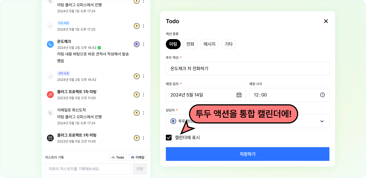 기존 미팅 관리 데이터가 투두에 통합되었어요! 투두리스트를 더 빠르고 쉽게 입력하고, 통합 캘린더에도 표시할 수 있어요.