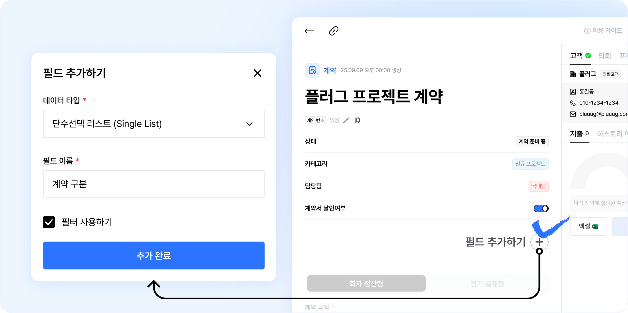 계약 > 계약 데이터 > 필드 추가하기 + 버튼으로 필드를 생성할 수 있어요.