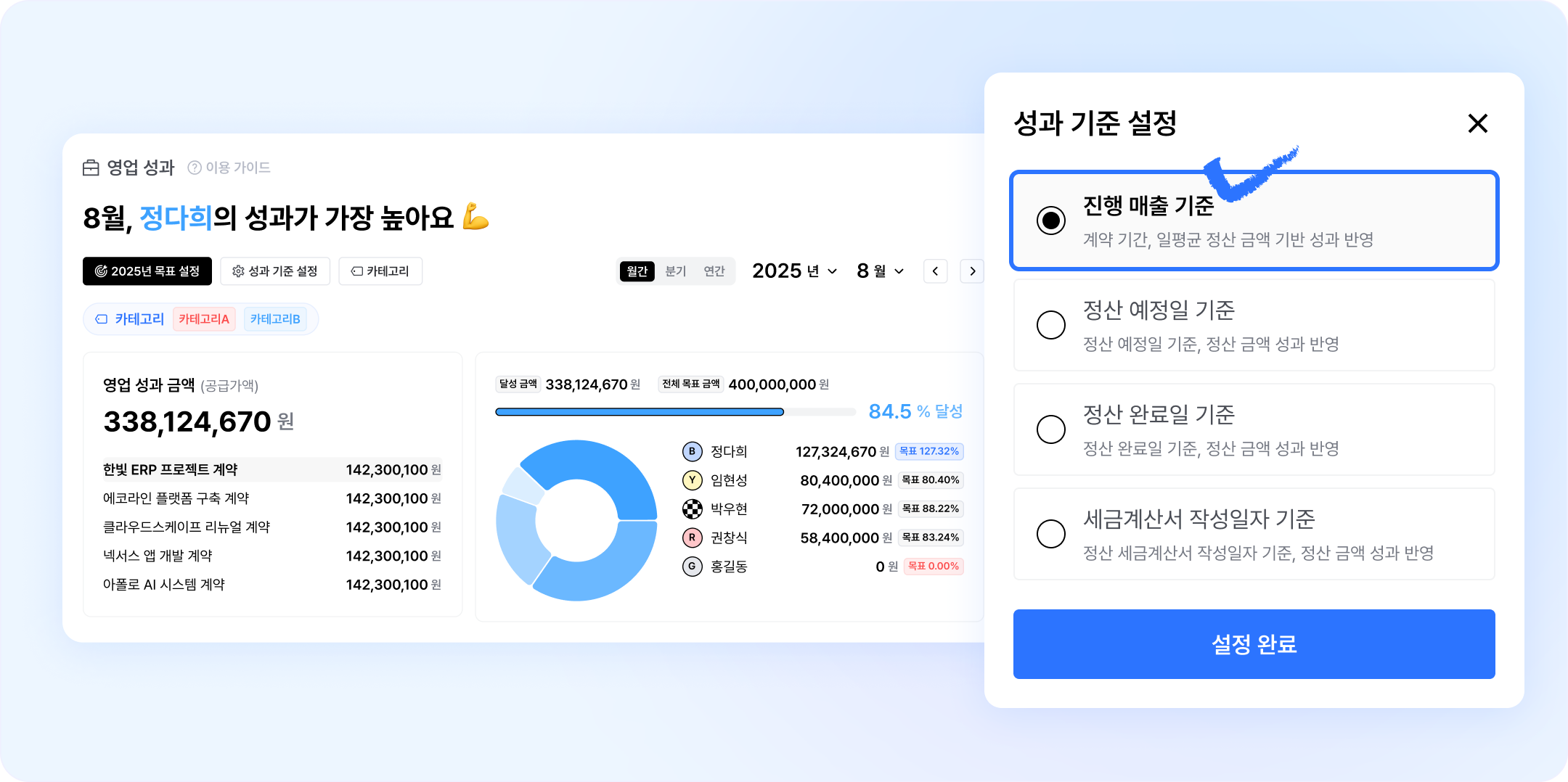 기존에는 '정산'의 순수한 일자만 참고하여 영업 성과를 확인할 수 있었는데요! 각 정산이 속한 계약의 기간까지 참고하여 [진행 매출 기준] 담당자 별 영업 성과를 확인할 수 있도록 기능이 업그레이드 됐어요.