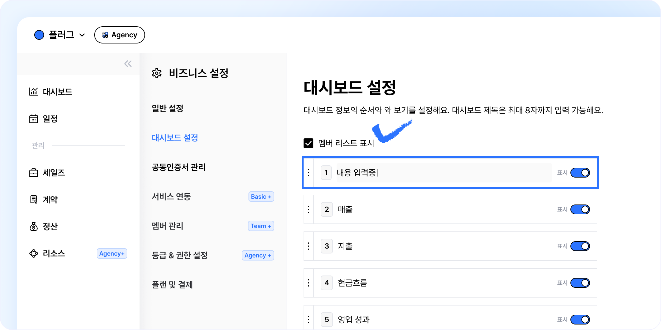 대시보드의 제목을 자유롭게 수정할 수 있는 기능이 추가됐어요. 이제 우리회사에서 명명하는 명칭으로 대시보드를 확인하고 소통 시 용이하게 사용해볼 수 있으며, 비즈니스의 멤버가 너무 많아지거나 공개하는 것을 원하지 않는 경우 프로필 표시를 숨길 수 있도록 기능이 추가됐어요.
