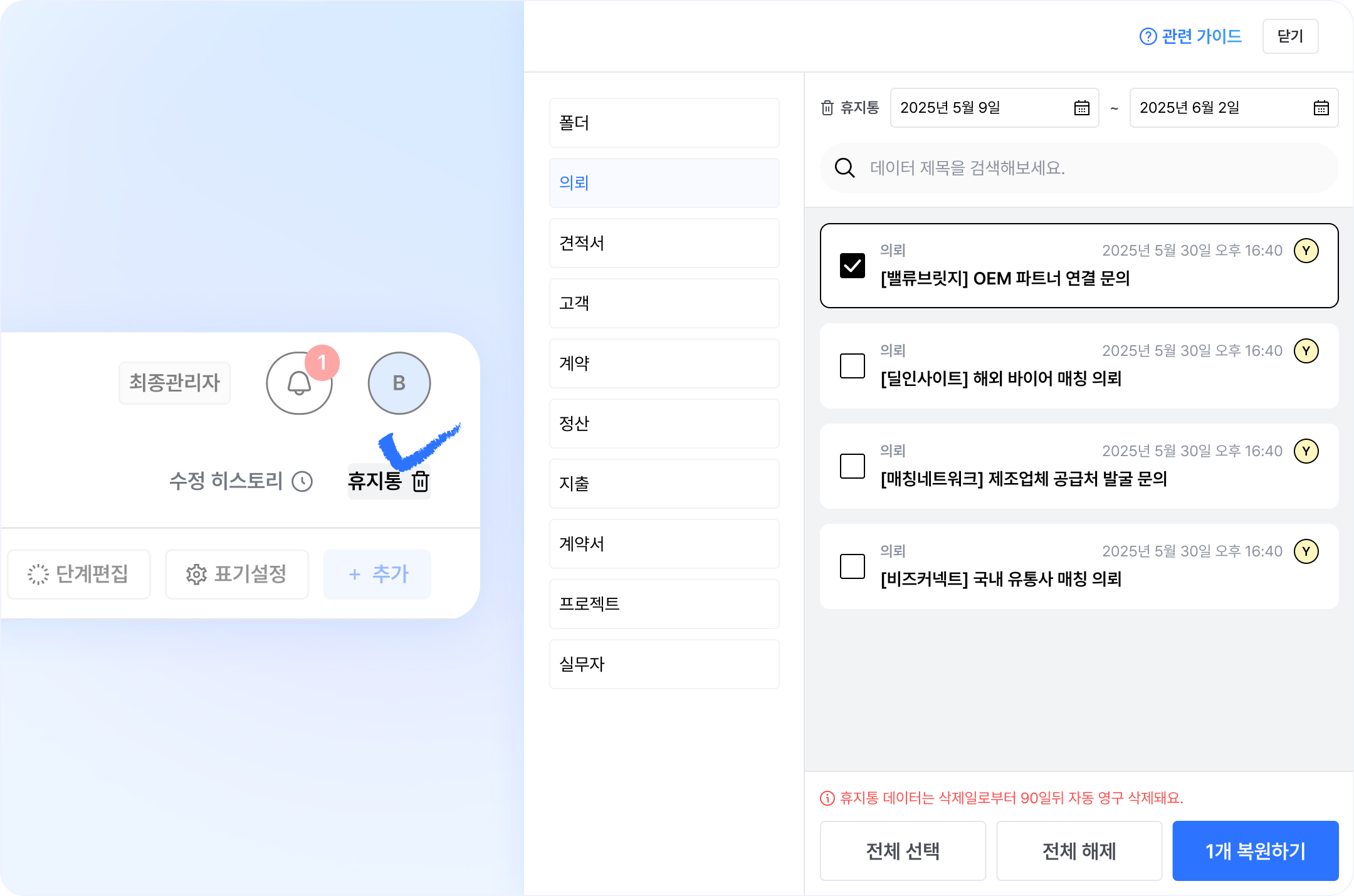 실수로 삭제한 데이터, 기존에는 다시 되살리기가 불가능했는데요, 업데이트 날짜 이후로 삭제된 데이터는 복원할 수 있는 기능이 생겼어요!