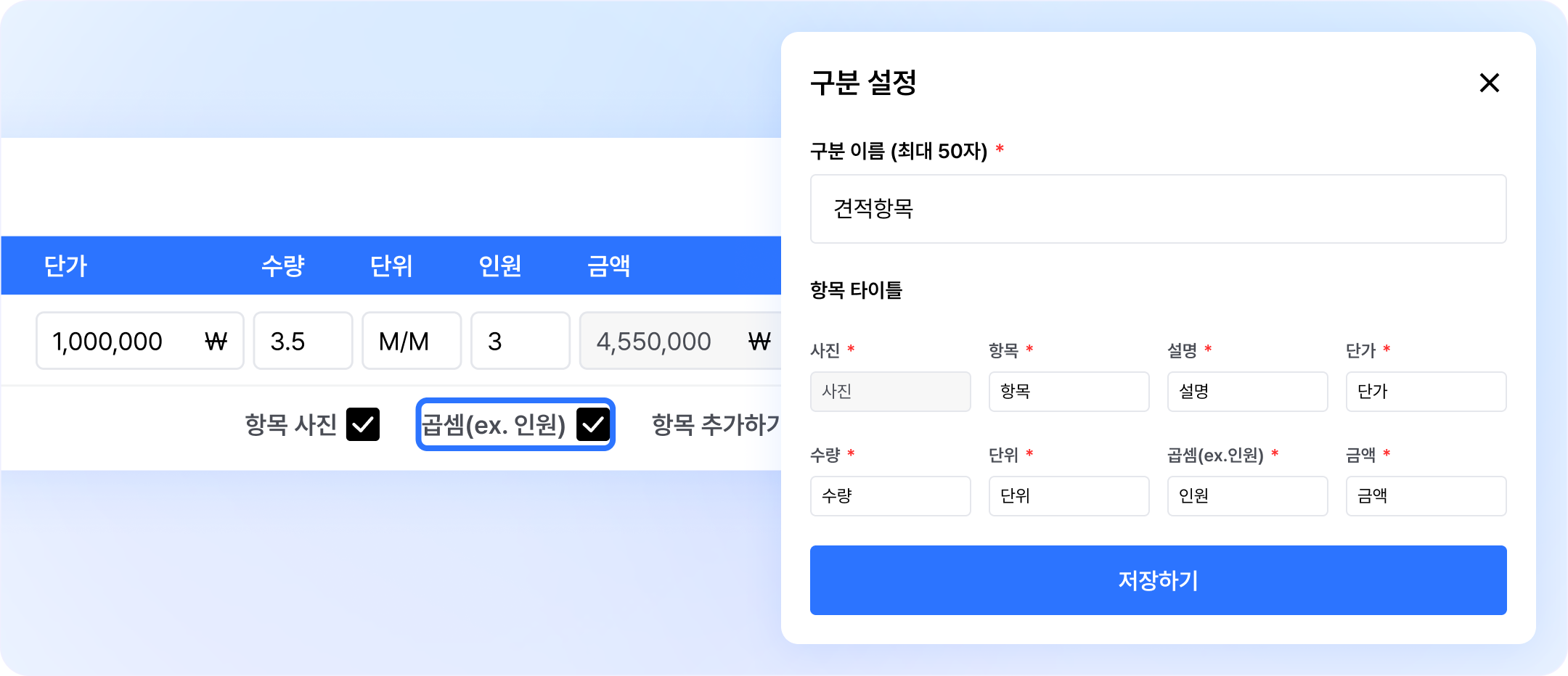 견적서에서 곱셈식으로 사용하는 [인원] 부분의 타이틀 텍스트를 수정할 수 있도록 기능이 추가됐어요. 곱셈으로 적용되는 모든 종류의 타이틀로 변경하여 활용해보세요.