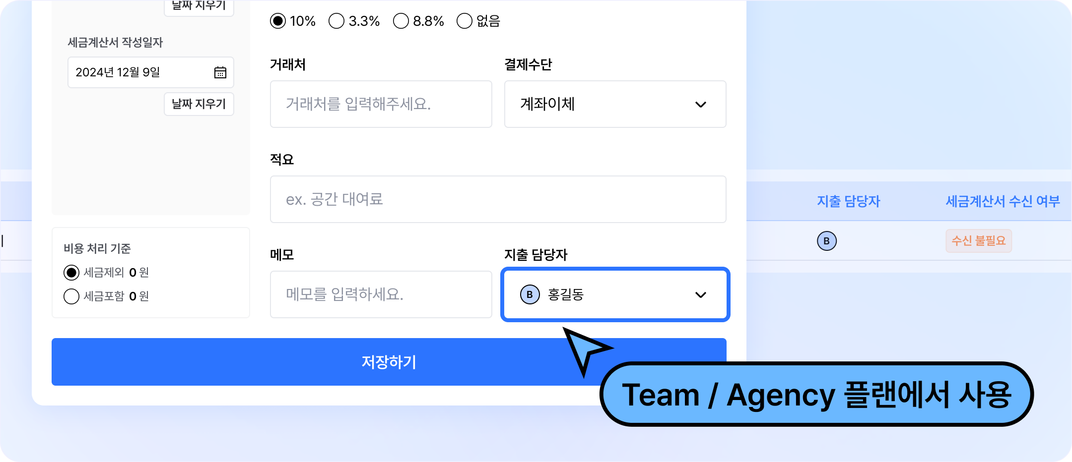 지출 데이터에서 '지출 담당자'를 추가할 수 있도록 필드가 추가됐어요. 담당자로는 비즈니스에 초대된 멤버 중에서 선택할 수 있어요. 해당 기능은 멤버 기능을 사용할 수 있는 Team 플랜부터 사용할 수 있어요.