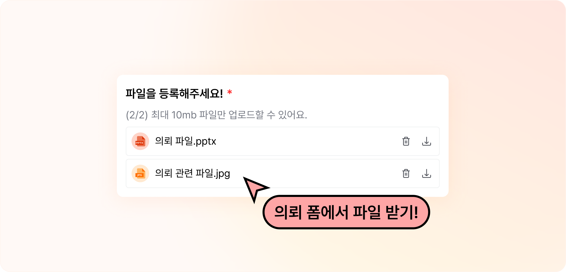 고객에게 문의를 받을 때, 필요한 문서를 첨부할 수 있도록 파일 등록 기능이 추가됐어요. 각 플랜 별로 고객이 업로드할 수 있는 최대 파일 개수가 한정되어있어요.
