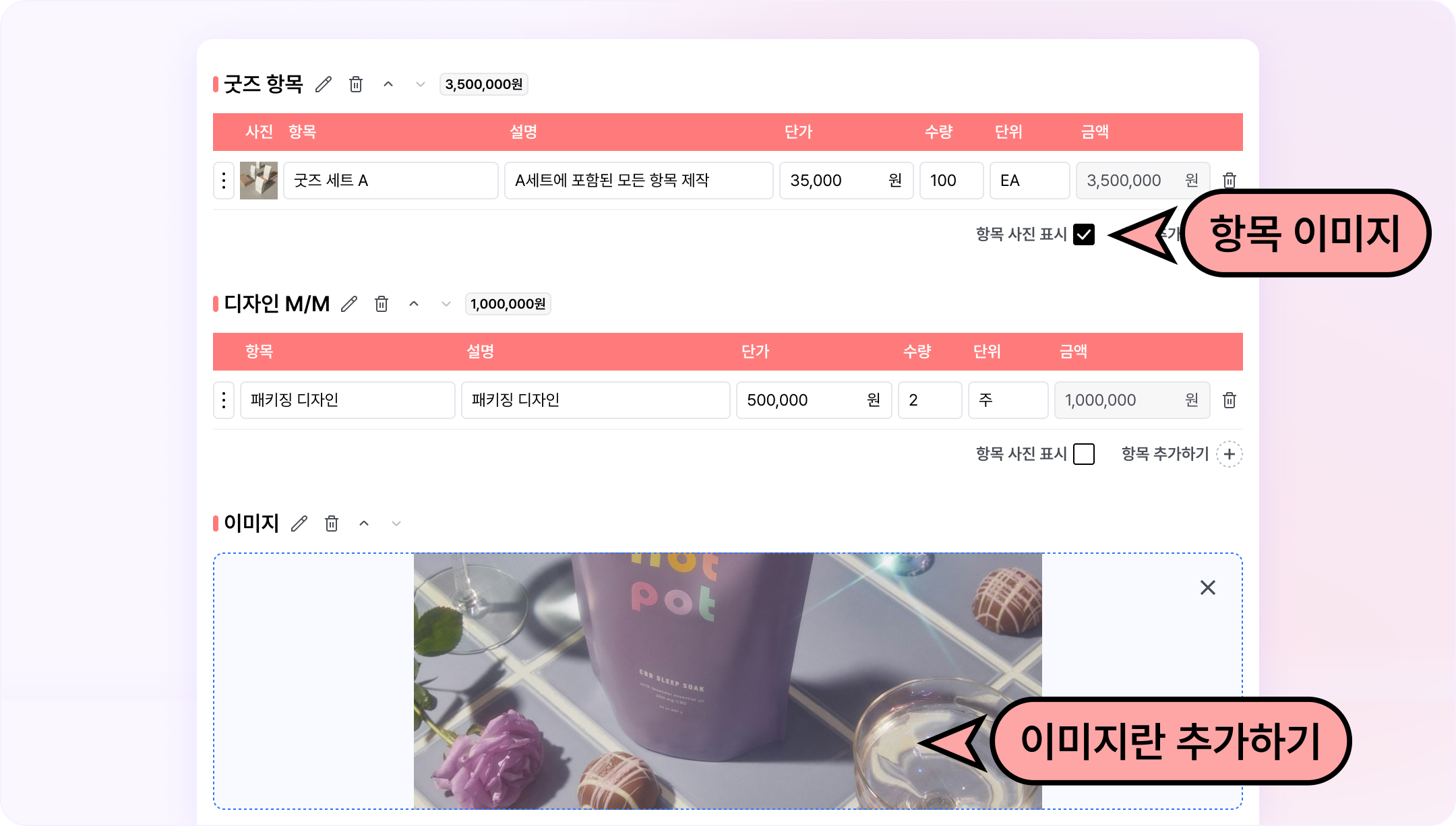 견적서 항목과 항목 템플릿에 이미지를 등록할 수 있어요.
