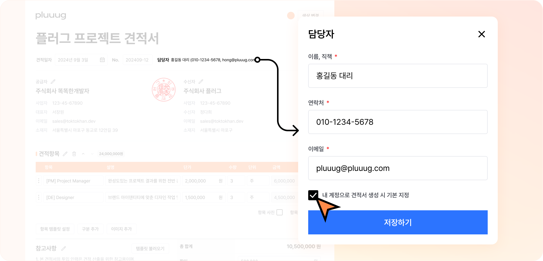 1) 견적서 작성 시 담당자 정보를 내 계정과 연결해 자동으로 입력해요.