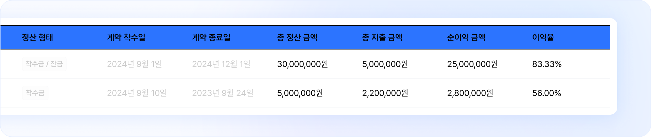 계약 표 view에서 계약별로 총 정산금액, 지출 금액, 순이익 금액, 이익율을 한 눈에 볼 수 있어요.