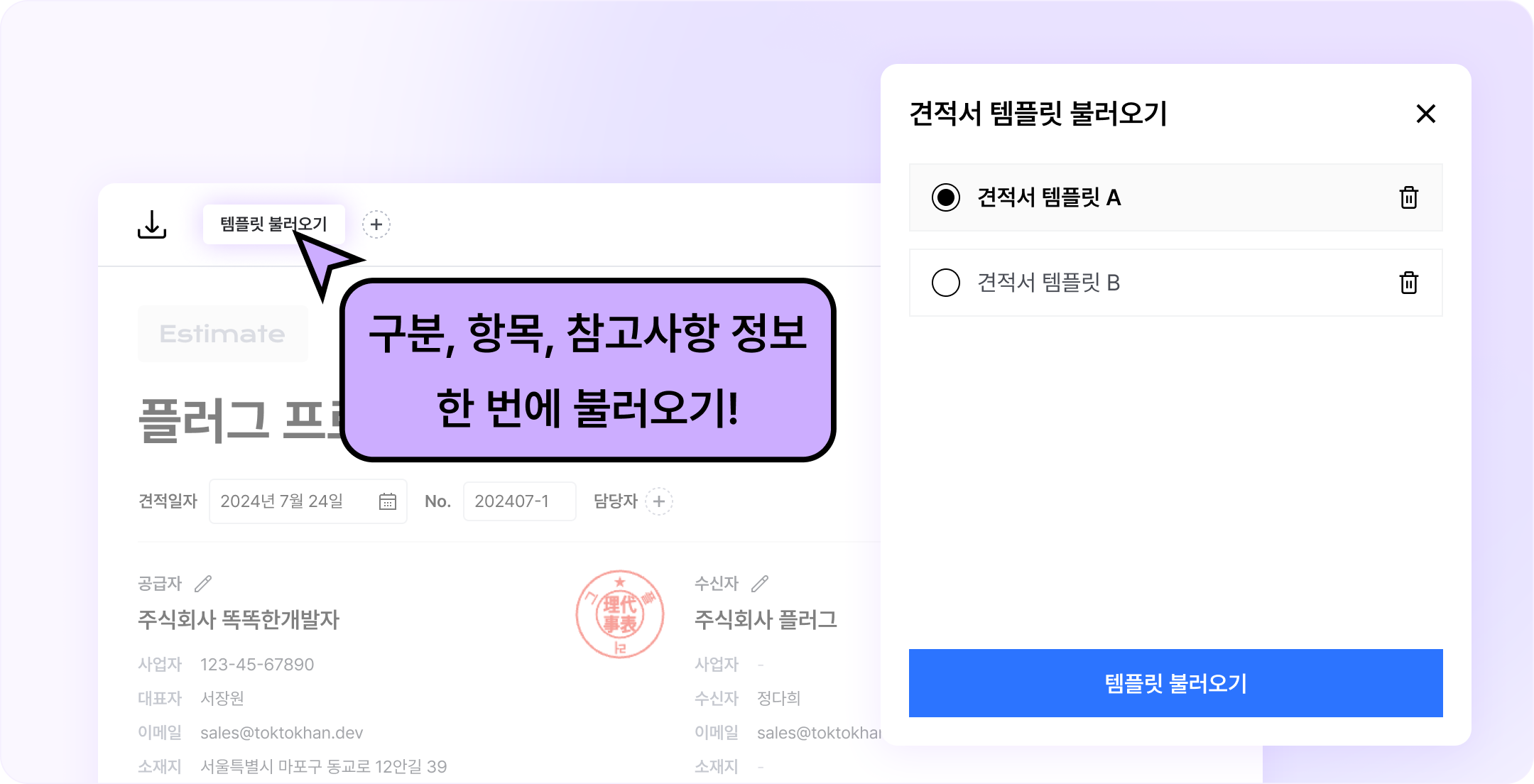 견적서에 작성해둔 구분, 항목, 참고사항, vat옵션 등을 모두 한 번에 템플릿으로 저장하고 불러올 수 있어요.