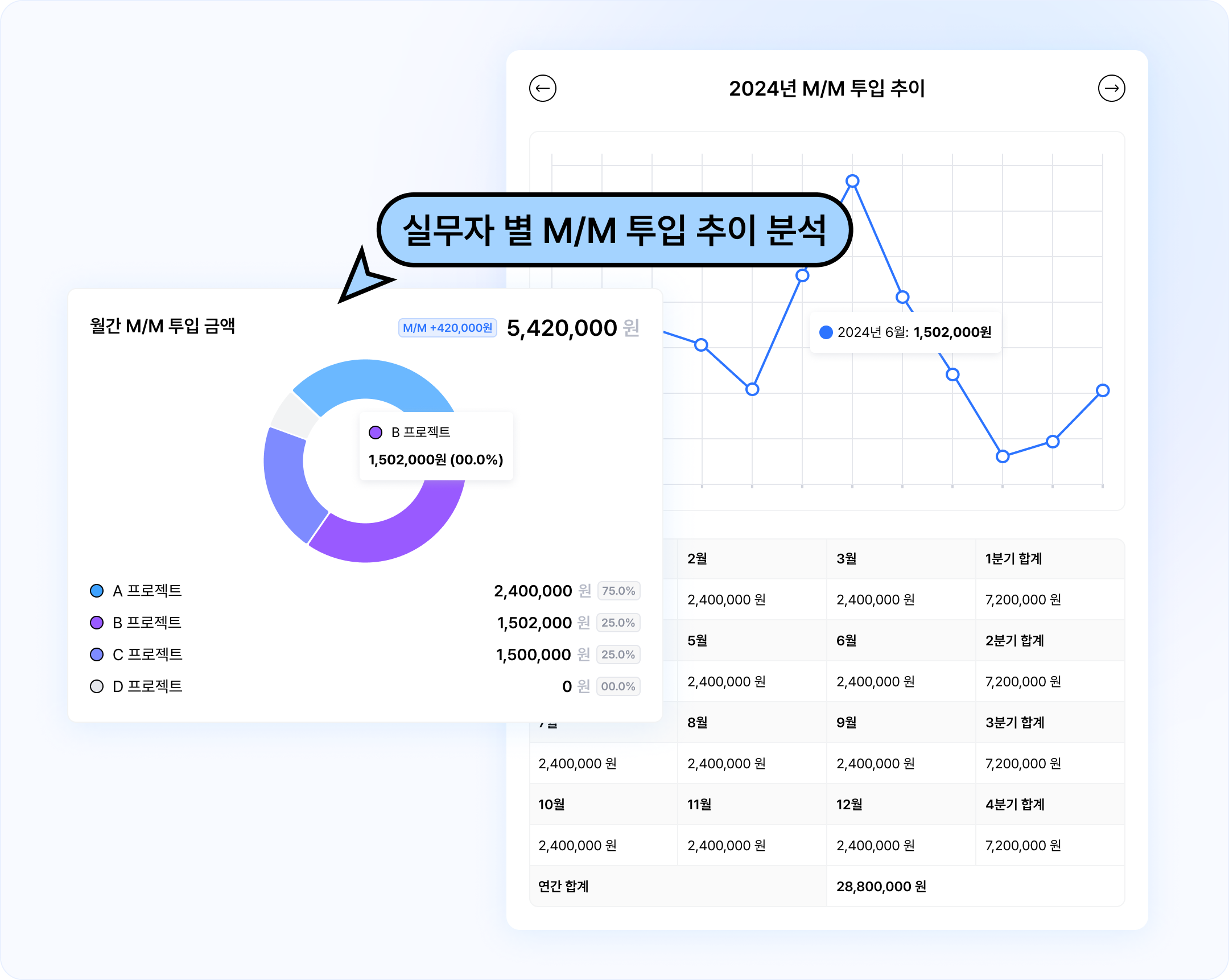 Agency 플랜에서 이용할 수 있는 '리소스' 기능에 M/M 분석 기능이 추가됐어요. 실무자 별로 월간 M/M, 프로젝트 투입금액을 알 수 있고, 년도, 분기, 월별 투입 금액 추이를 한 눈에 확인할 수 있어요.