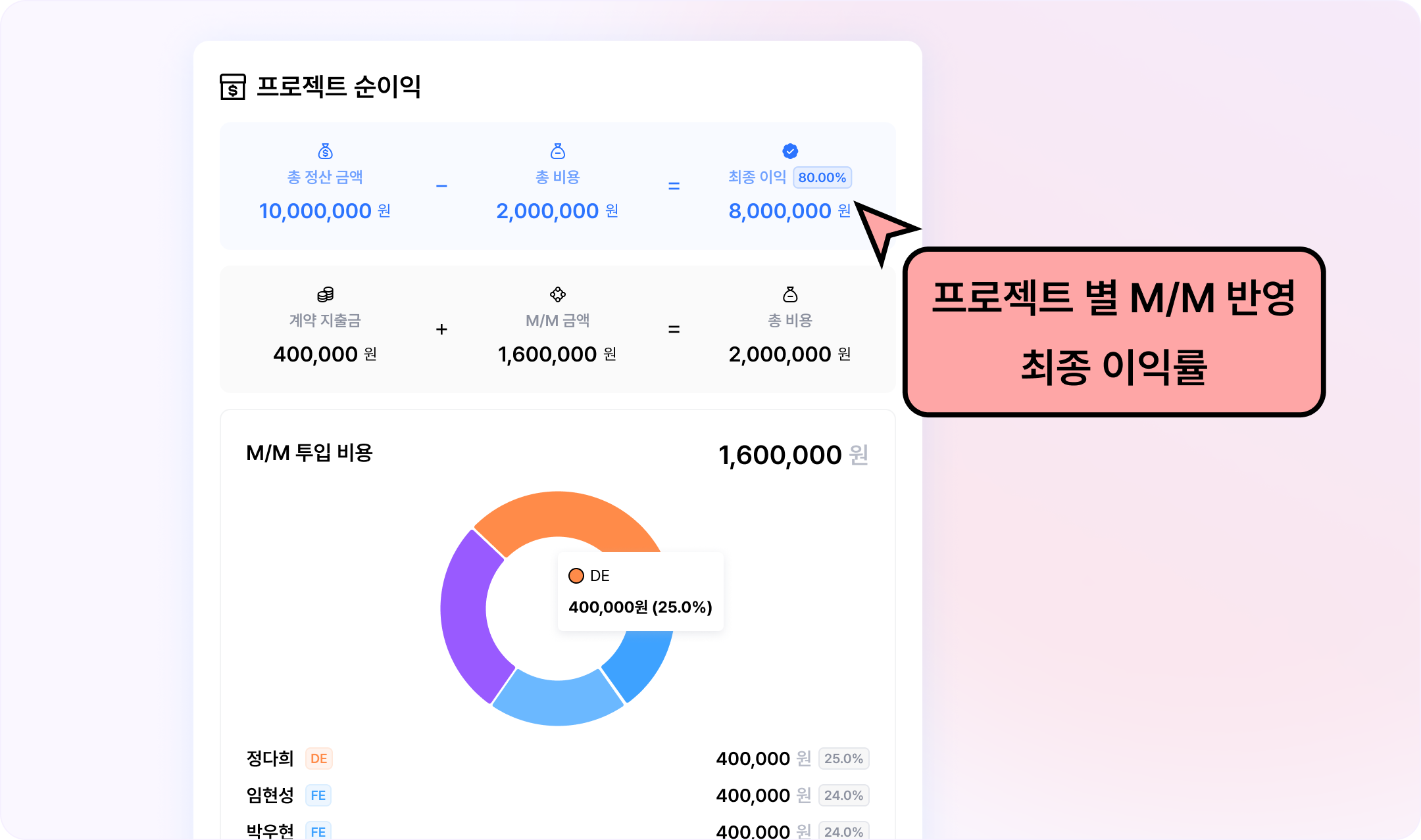 각 프로젝트별로 투입된 M/M 금액이 자동으로 계산돼요. 연결된 계약에서 지출된 금액까지 합산하여 프로젝트의 최종 이익율을 알 수 있어요.