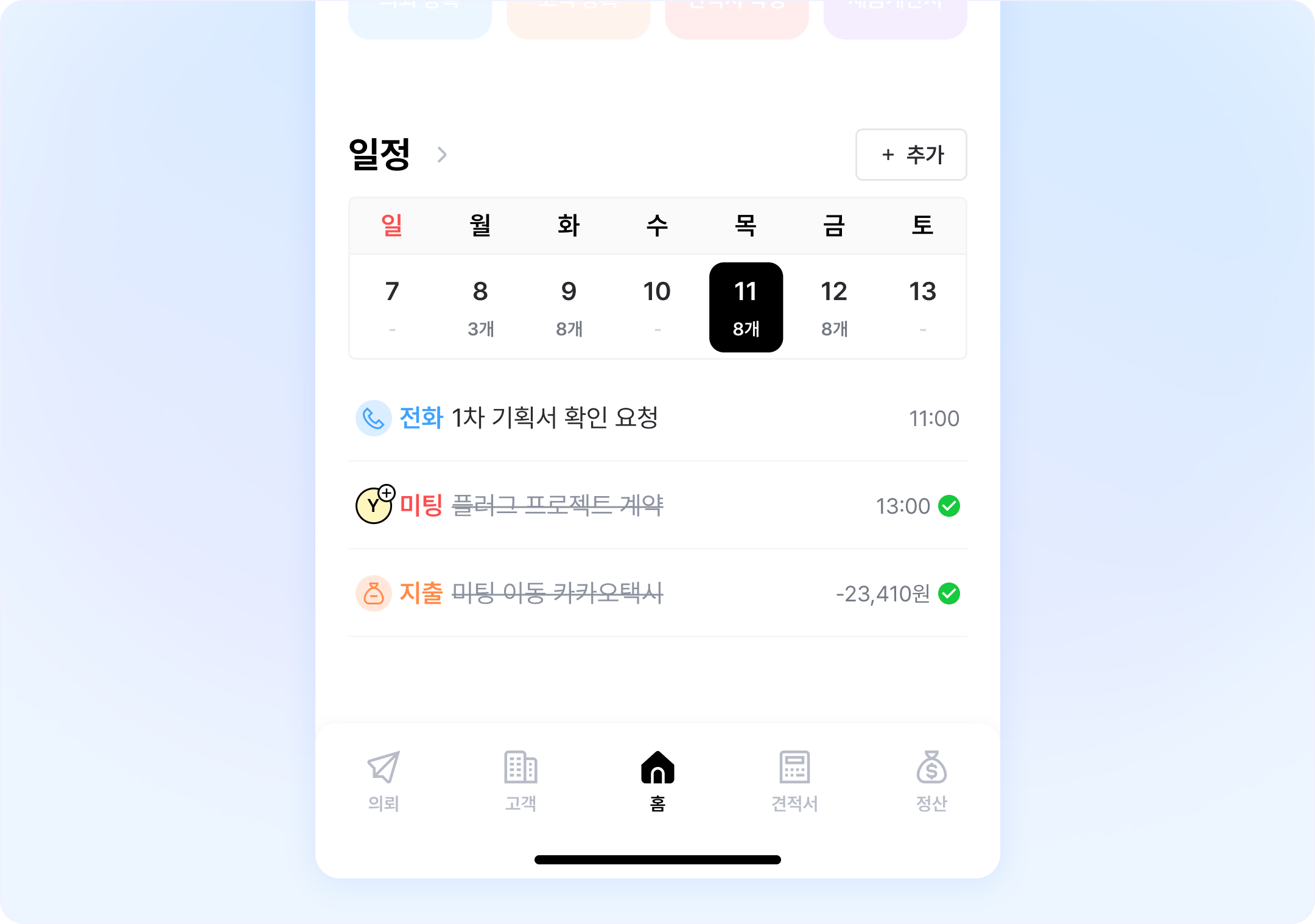 외근이 잦은 영업 담당자가 주로 사용하는 영업 기능들과, 급한 처리가 발생할 수 있는 기능들을 빠르게 찾을 수 있도록 하단 메뉴와 홈 화면을 개편했어요. 고객 정보를 찾거나, 영업 정보를 빠르게 추가하거나, 견적서와 세금계산서 발행을 빠르게 처리할 수 있어요.