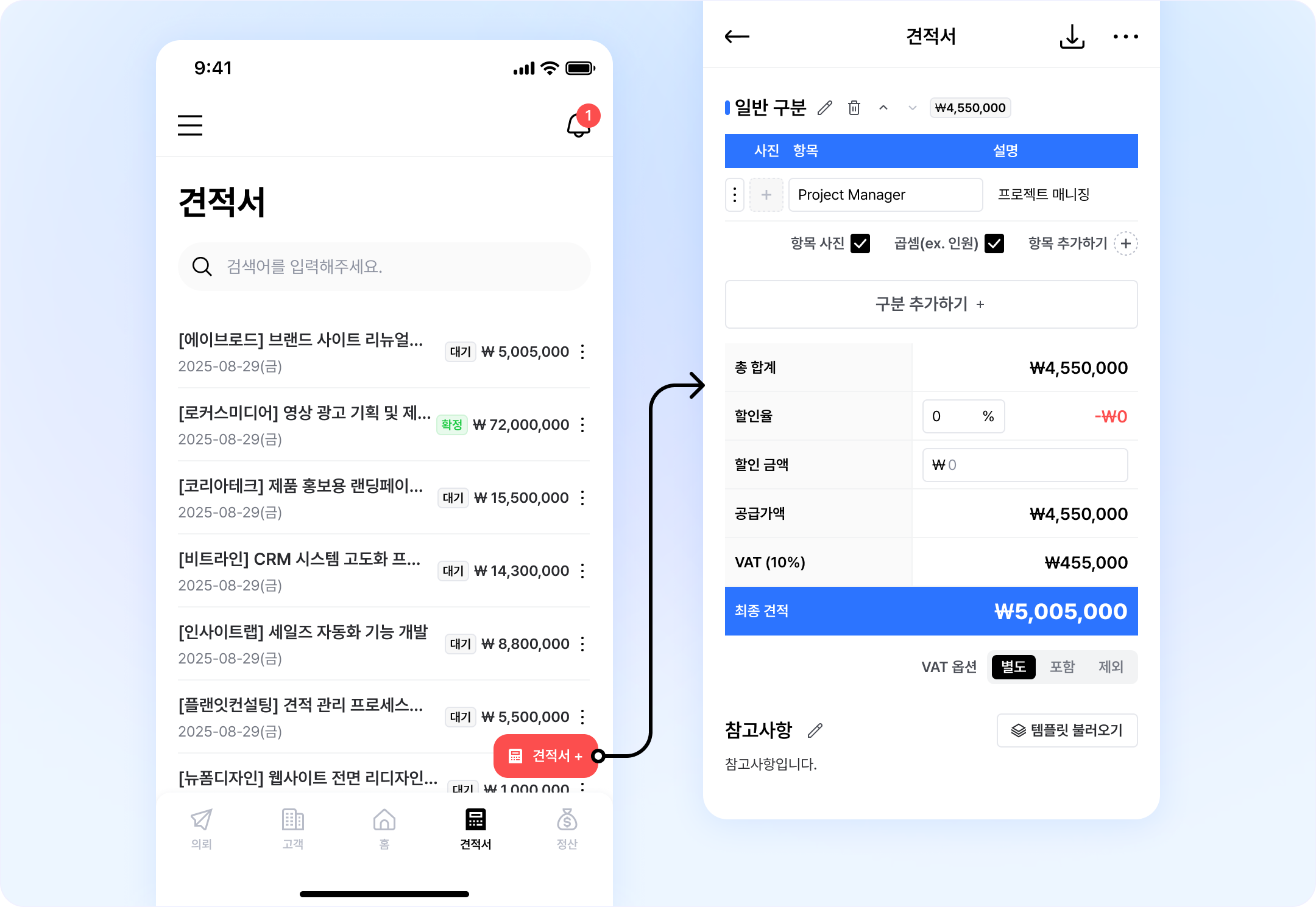외부에서도 빠르게 견적 작업을 처리할 수 있도록, 견적서 메뉴가 하단 네비게이션에 추가됐어요. 일일이 의뢰를 찾아서 들어가지 않고, 바로 리스트를 확인하거나 추가하고, PDF 다운로드 & 발송까지 할 수 있어요.
