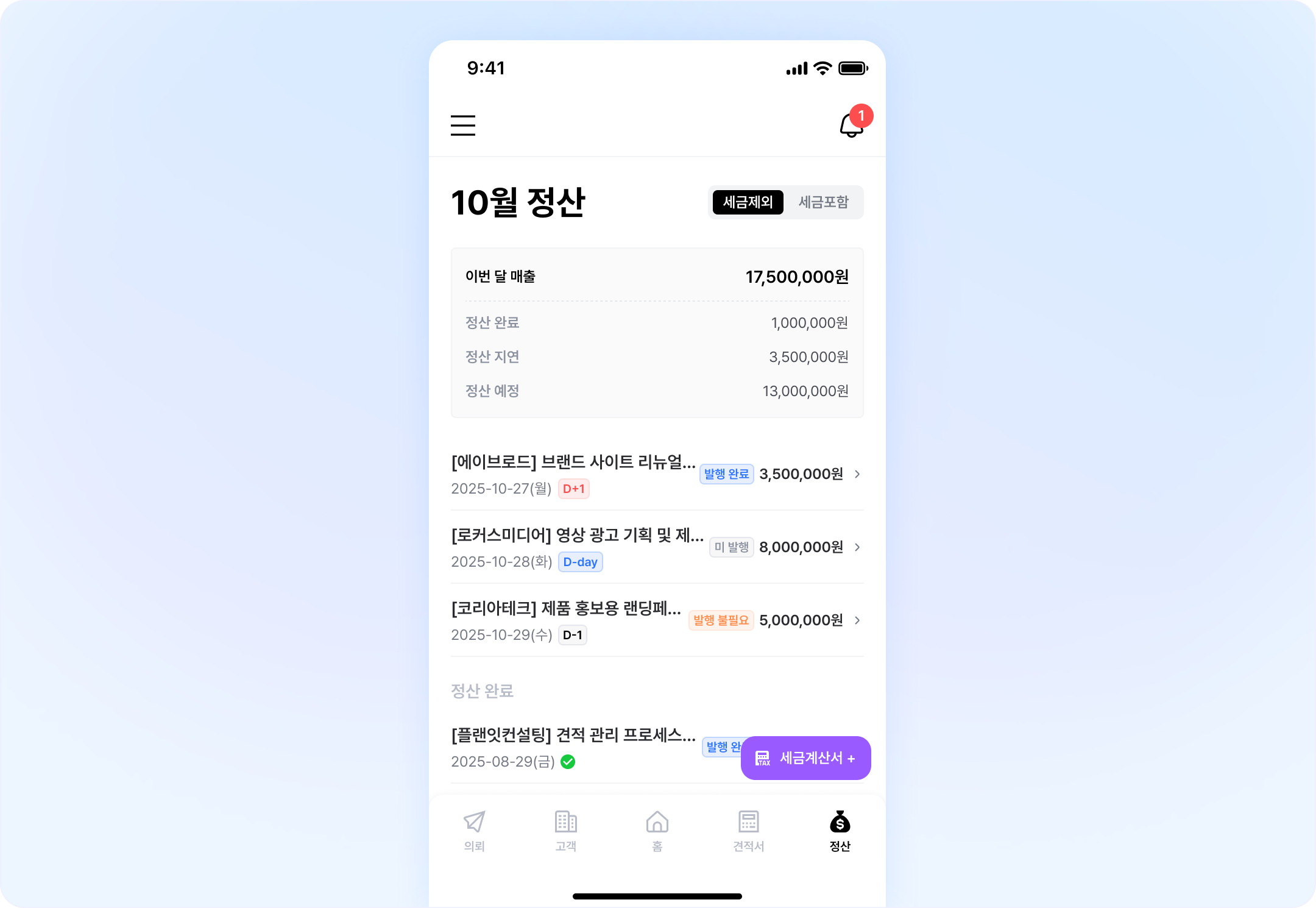 각 정산 리스트 안에서 세금계산서를 발행하거나, 거래명세서를 작성할 수 있어요.