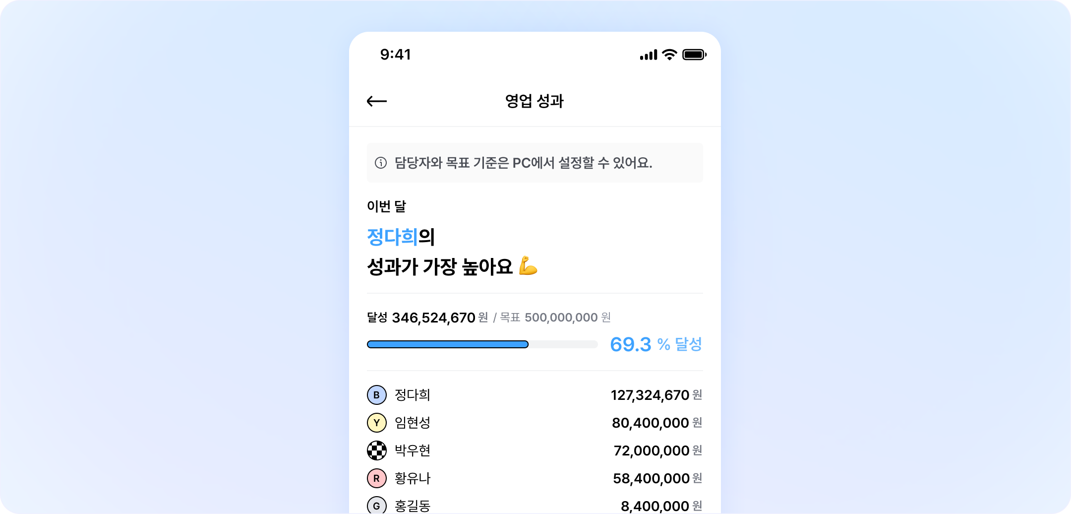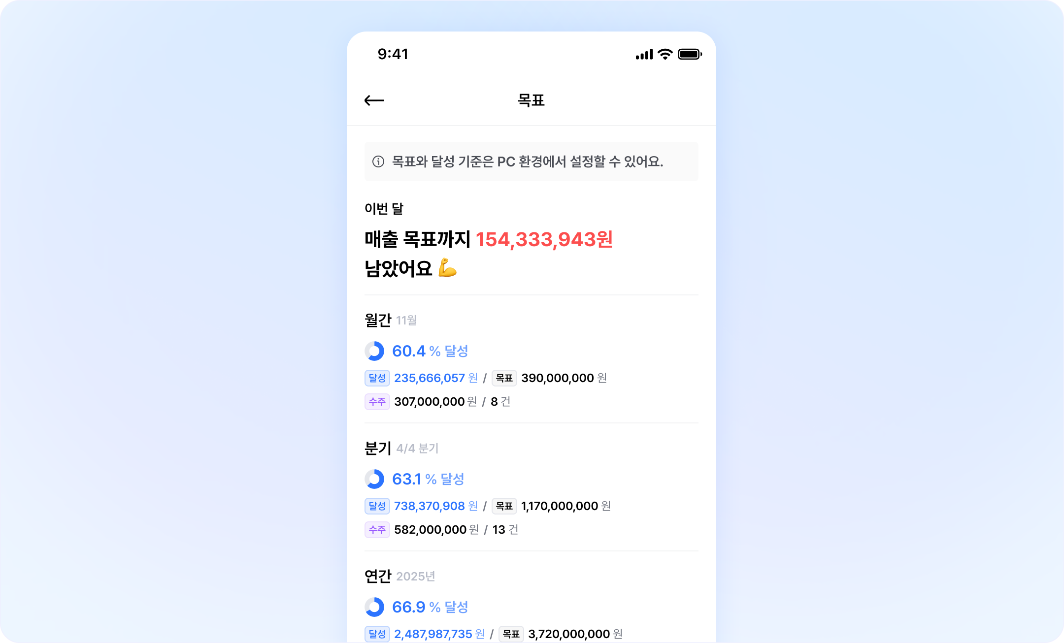 연/분기/월간 목표, 달성, 수주 금액과 건 수를 확인할 수 있어요.
