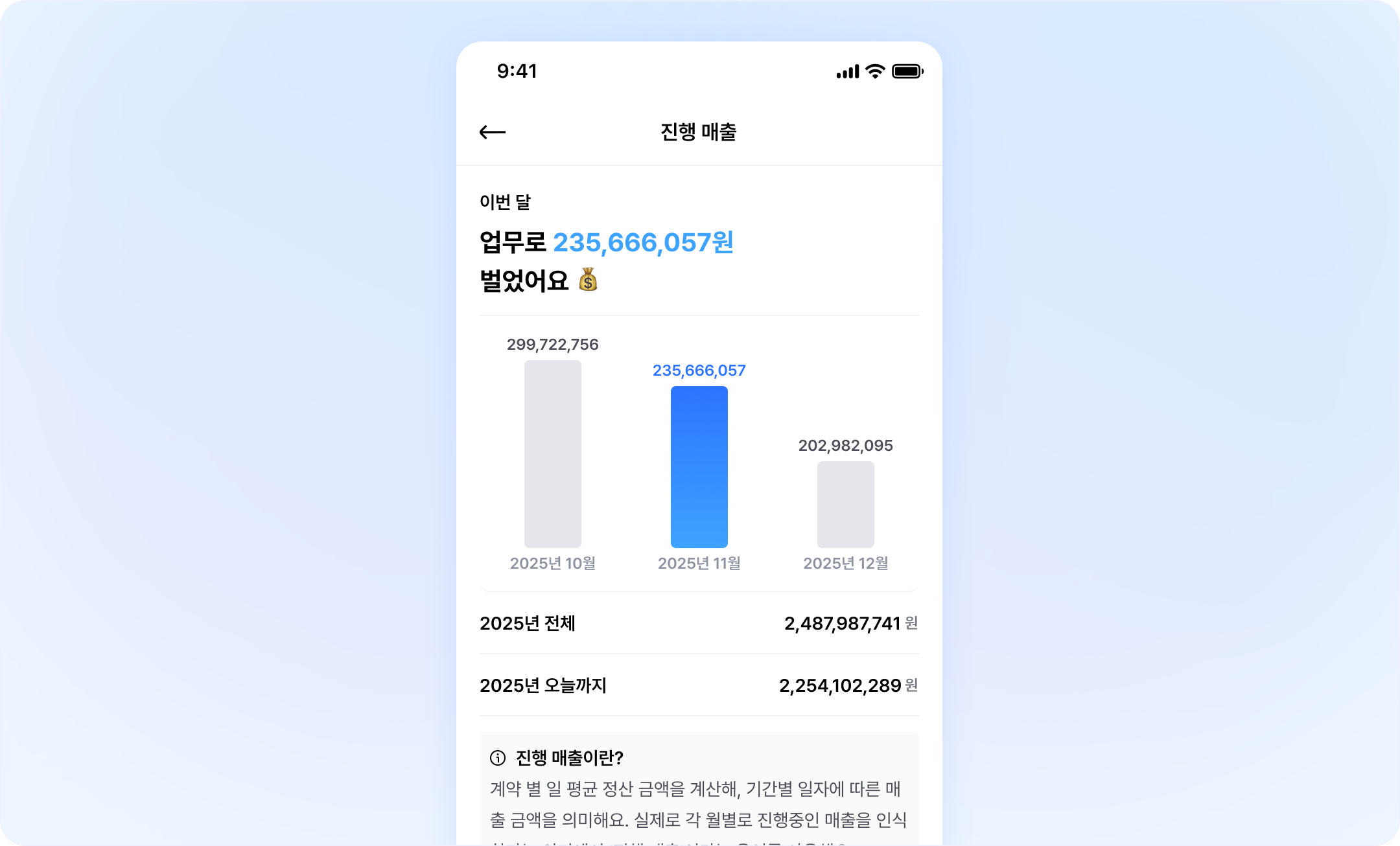 계약 별 일 평균 정산 금액을 계산해, 기간별 일자에 따른 매출 금액을 의미해요. 실제로 각 월별로 진행중인 매출을 인식한다는 의미에서 ‘진행 매출'이라는 용어를 사용해요.