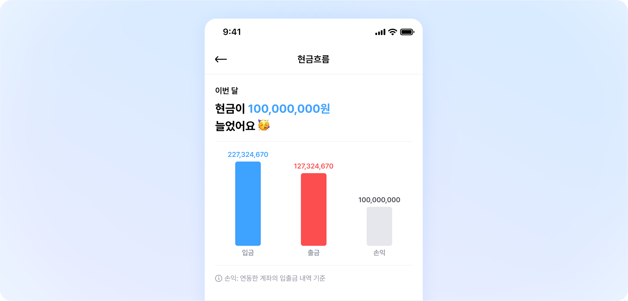 연동한 입출금내역 계좌의 입금, 출금 금액을 기준으로 이번 달 현금 흐름을 확인할 수 있어요.