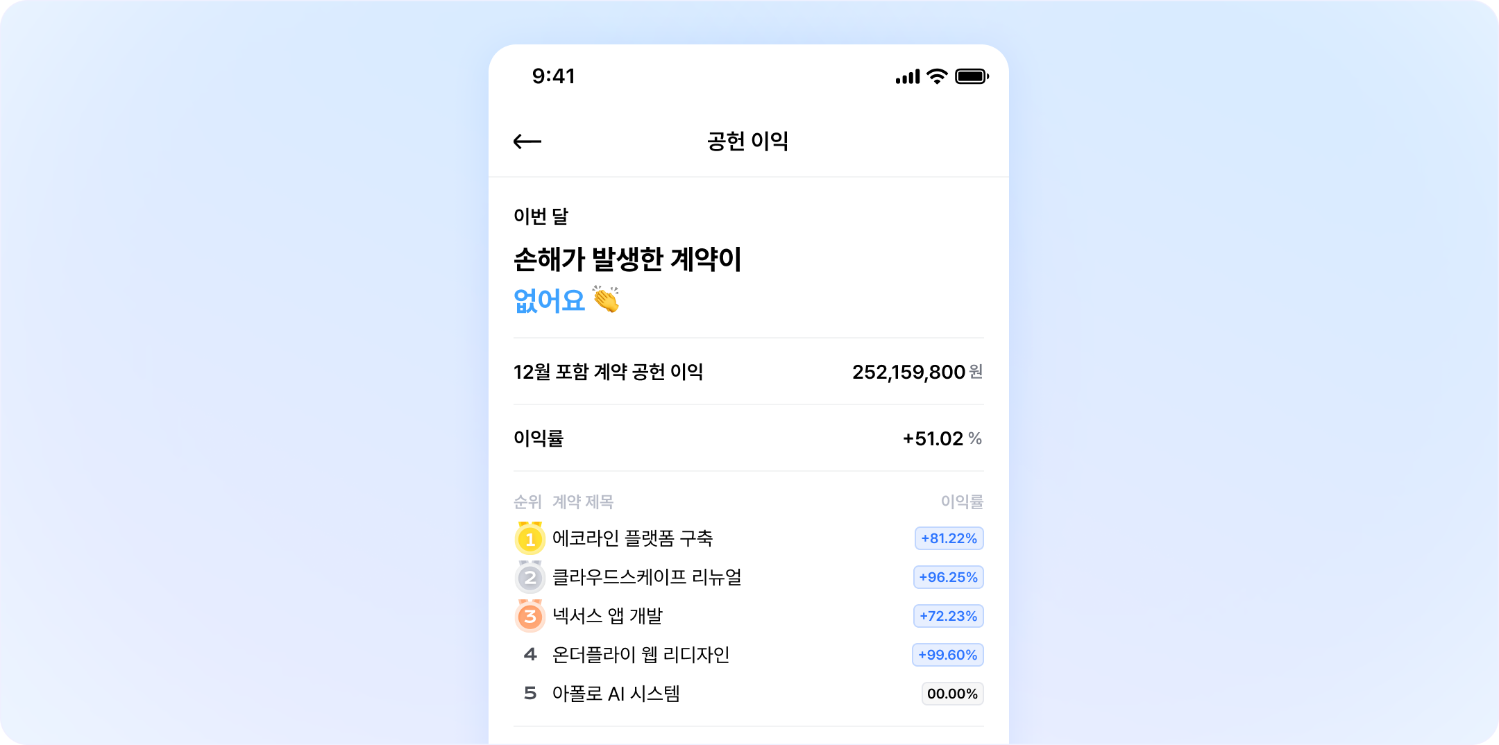 이번 달 안에 하루라도 포함된 모든 계약의 최종 이익률을 확인할 수 있어요.