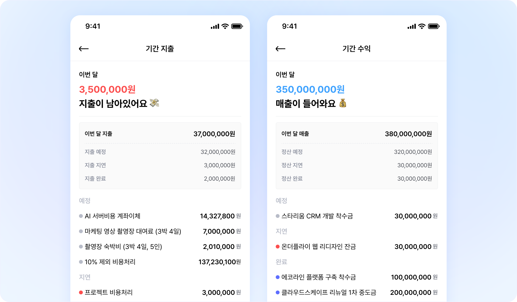 이번 달 지출과 정산 예정, 지연, 완료 리스트와 금액을 확인할 수 있어요.