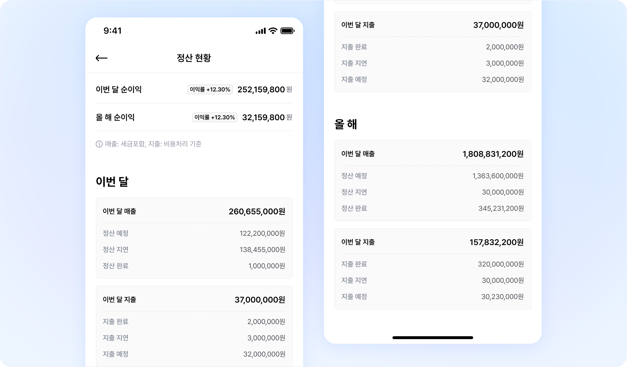 이번 달, 올 해의 매출 / 지출 금액 집계와 순이익을 빠르게 확인할 수 있어요.